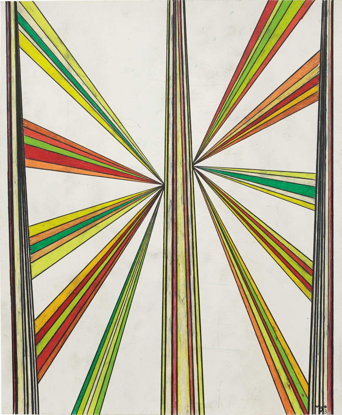 Grotjahn’s renowned butterfly drawings—as evinced in the present, perfectly representative lot, Untitled (Butterfly)—gently unify geometric abstraction and the natural world. The butterfly motif is based around a central line that runs vertically down the composition; the open wings rendered in primary colors emanate outward with a heavy sense of applied force and rigorous execution. Grotjahn utilizes two-point perspective to create the semblance of depth allowing the butterfly to float off the page. As Grotjahn states, “You can see in my butterfly works that they are very obsessive.” (Mark Grotjahn in M. Gnyp, Mark Grotjahn, Zoo Magazine #38) They illustrate an intensive and pre-planned geometric scheme. The rational form and perspective of the drawing is balanced by the playful bright hues of red, green, orange and yellow butterfly wings.