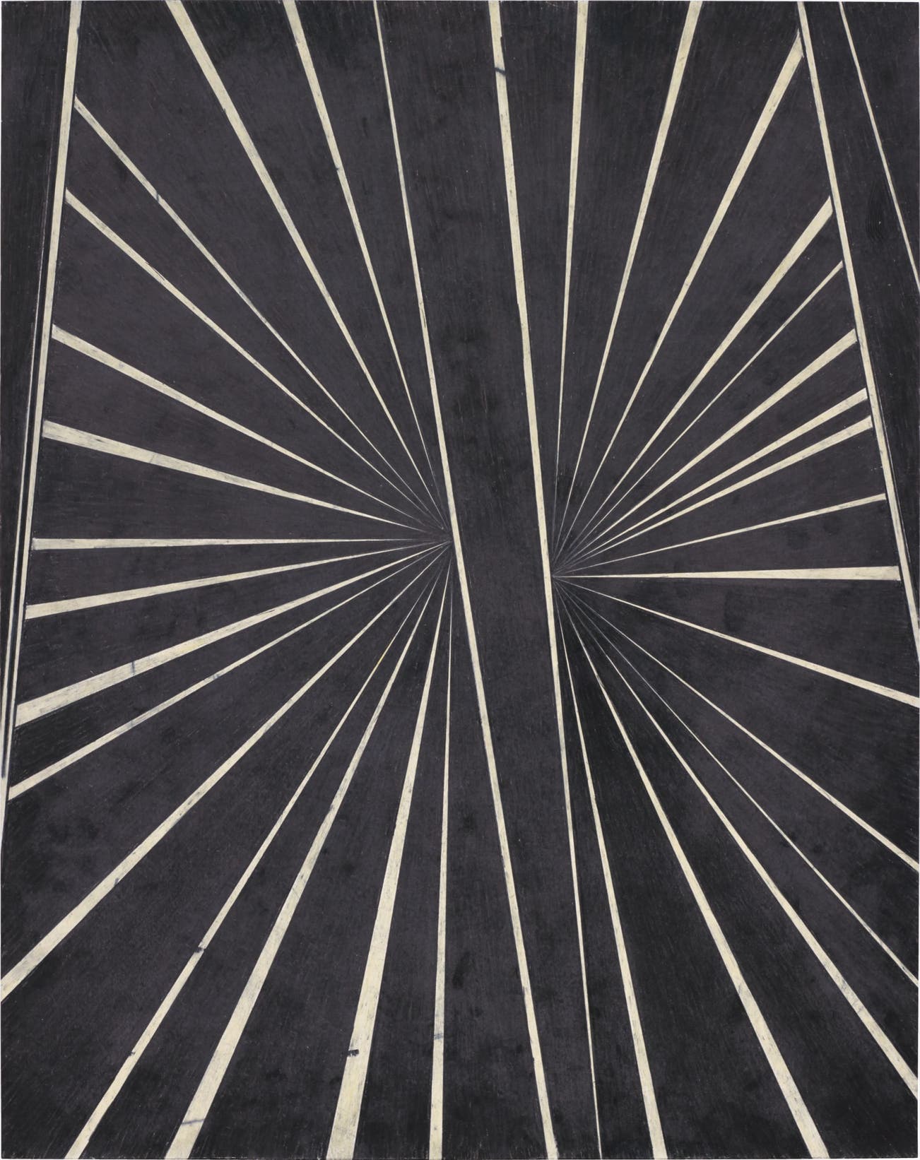For over two decades, Mark Grotjahn has explored the structures of geometric formalism and serial repetition to become one of the leading abstract painters working today. His deceptively simple trademark form consists of radiating lines converging on one or more vanishing points, which he identifies as 'butterflies.' Here the form is rendered in a stark black and white duotone palette imbuing the work with a sort of hypnotic quality. The composition is divided equally by a central axis upon which diagonal lines race outwards from two slightly off-kilter vanishing points. The expansive rays create a mesmerizing optical illusion as they appear to both approach and recede with high-speed momentum. These dynamic lines are halted by the longitudinal bands that bisect and ring the edges of the canvas, bringing it back to the level ground of modernist flatness. "The butterfly has become to Mark Grotjahn what the target is to Kenneth Noland, the zip was to Barnett Newman, and the color white is to Robert Ryman, Grotjahn's abstracted geometric figure is suitably elusive. In fact, the more familiar it becomes, the more he refines its ability to surprise and, perhaps paradoxically, takes it further away from actual butterflyness." (M. N. Holte, “Mark Grotjahn: Blum and Poe,” Artforum, vol. 44, no. 3, November 2005, p. 259)