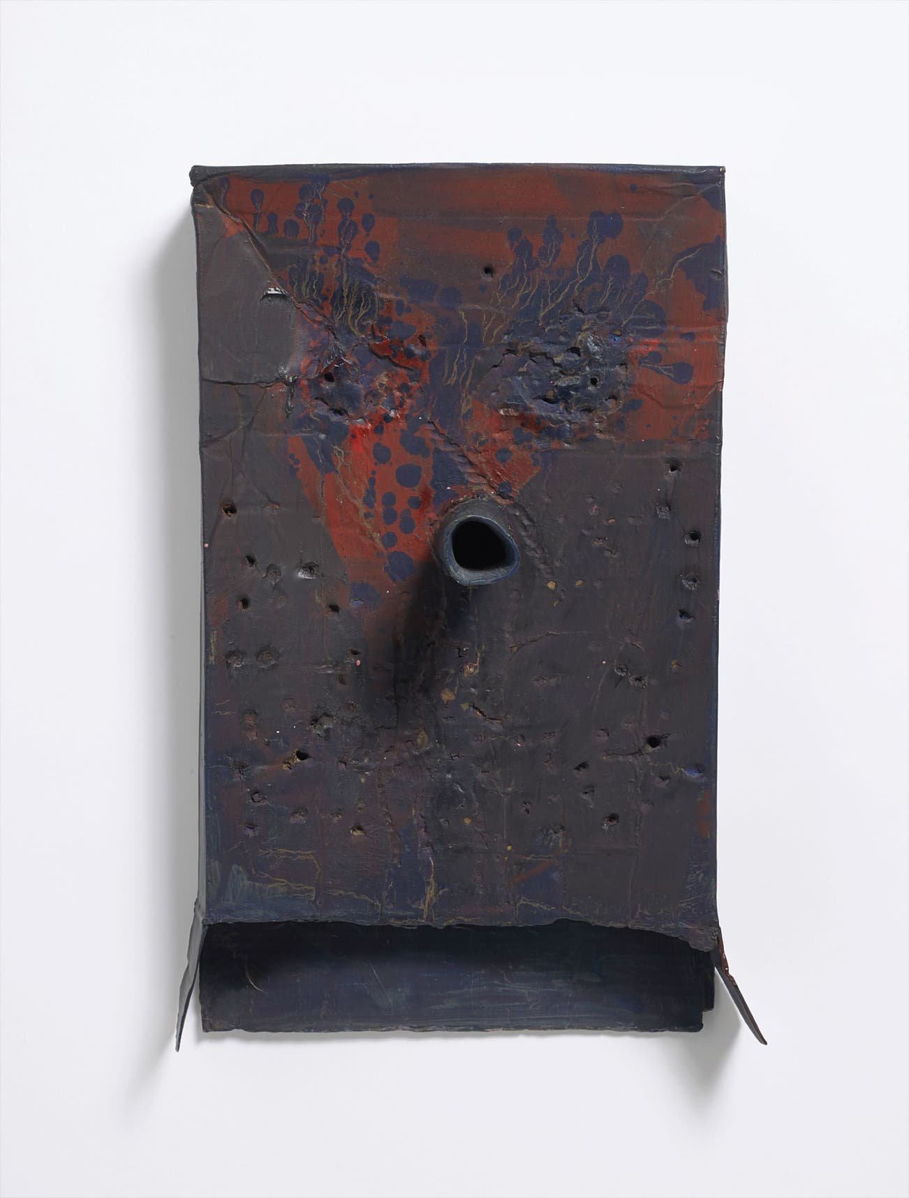 Mark Grotjahn’s wide-reaching artistic oeuvre can crudely be divided into two broad categories: the Faces and the Butterflies. The latter of these is associated with an analytic regularity emphasising strict angularity and colour dissection, while the former negates any order or clarity in favour of texture and spontaneity. Untitled (Blue Eyes Brown Hanging Perforated Mark M3.d) as the title suggests, falls into the Faces group. As part of Grotjahn’s more recent chapter of artistic development, these works mark a distinct shift away from painting into sculpture. However, a defining characteristic of these pieces is, conflictingly, their inherently painterly surface made possible through Grotjahn’s elaborate and unique creative process.