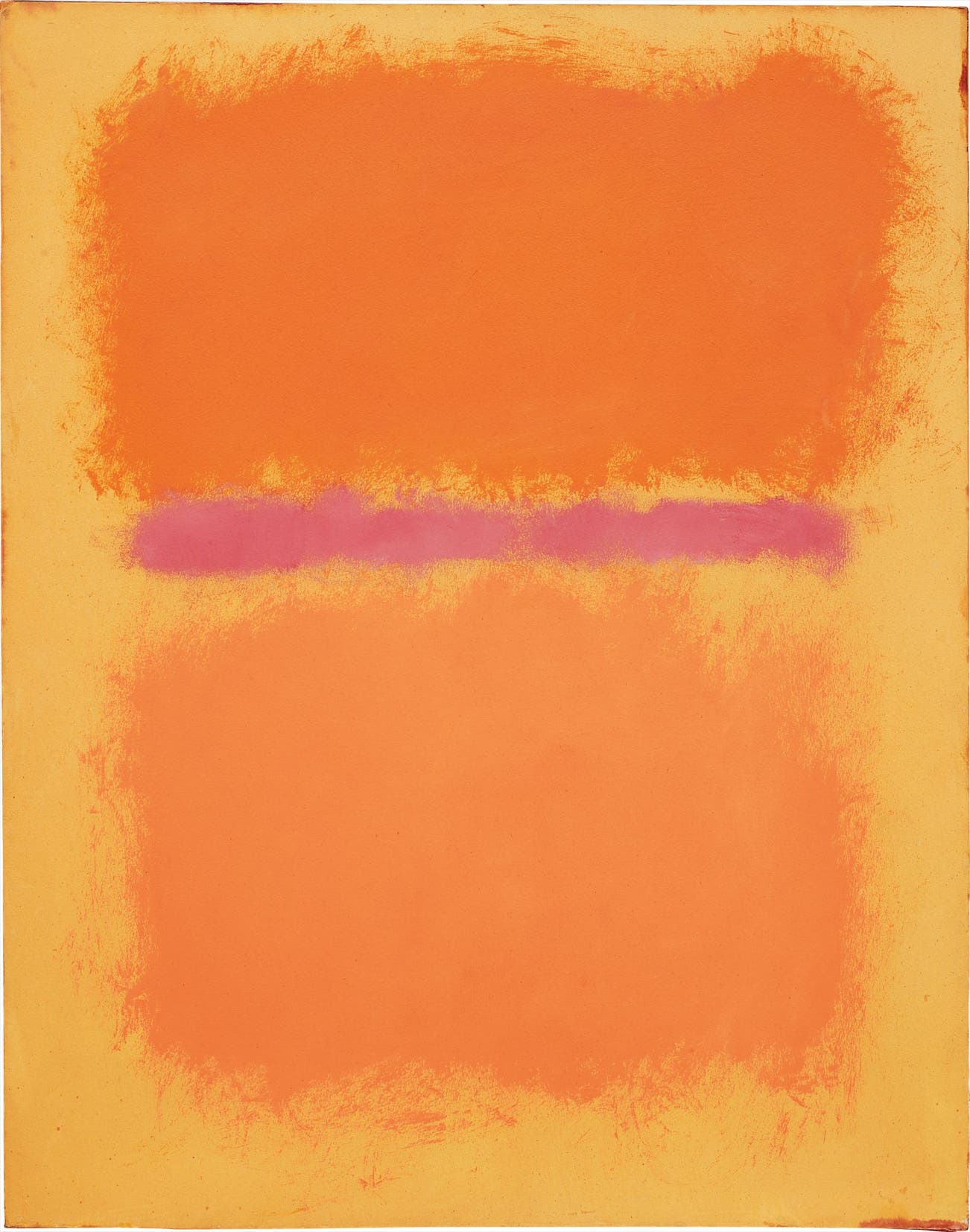 And if we are to categorize the nature of each soul inherent in Rothko’s paintings, the present lot is certainly one of transcendent ecstasy. Contained within the boundaries of its edges is an overwhelmingly bright interaction of free-floating shapes, hovering celestially upon a sheet of pale orange. The background of Rothko’s medium bears a wondrous uniformity of saturation, employing its unique intrinsic properties to conceal the gentle brushstrokes of the artist. While the least intense in its chromatic scope, Rothko’s background is also the brightest, departing from the tendency of many of his multiform paintings to possess dazzling rectangular shapes upon a comparatively dark background. As the delicate fibers of the paper could only support a finite number of layers, we can assume that Rothko’s pale orange background is a single sheet of color, and one that supports the layers above it.