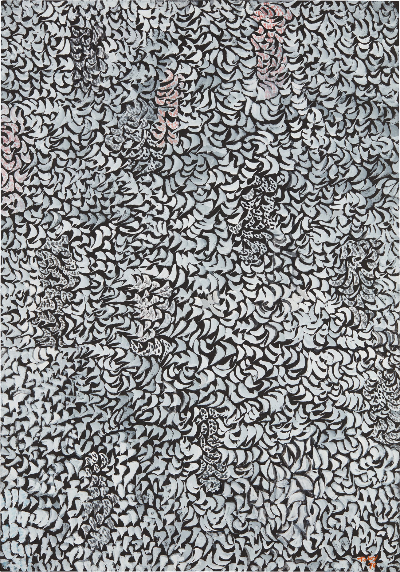 A key figure in post-war American painting, Mark Tobey developed a distinctive visual language over the course of fifty years, conjuring American, European, and East Asian iconographic elements in poetically abstract paintings. Replete with forms resembling Chinese, Persian, Arabic and Zen inscriptions, the American artist’s work mirrors his peripatetic life, and hovers somewhere between sensuous abstraction and original calligraphy. Between Black and White, 1970 is emblematic of this complex aesthetic, and boasts Tobey’s iconic idiosyncratic “white writing” that weaves webs of letter-like symbols on the entirety of the painted surface. Reminiscent of the Abstract Expressionists’ “all-over” compositions, the present work equally summons questions on physicality and space. A meticulous construction of undulating white lines, Between Black and White indeed demonstrates Tobey’s exceptional capacity to create an illusion of spatial infinity, blurring the line between pictorial flatness and three-dimensionality.