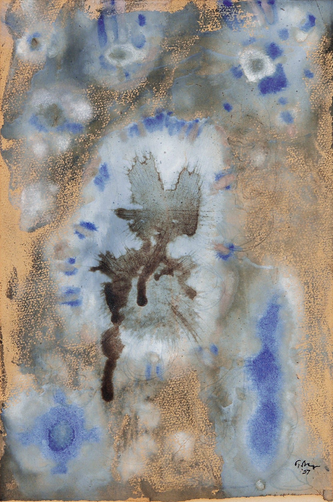Painted in 1957, this work is registered with the Mark Tobey Project, LLC under the identification number MT[138-2-9-11] and is listed in the Paul Cummings archive at the Mark Tobey Project, LLC.