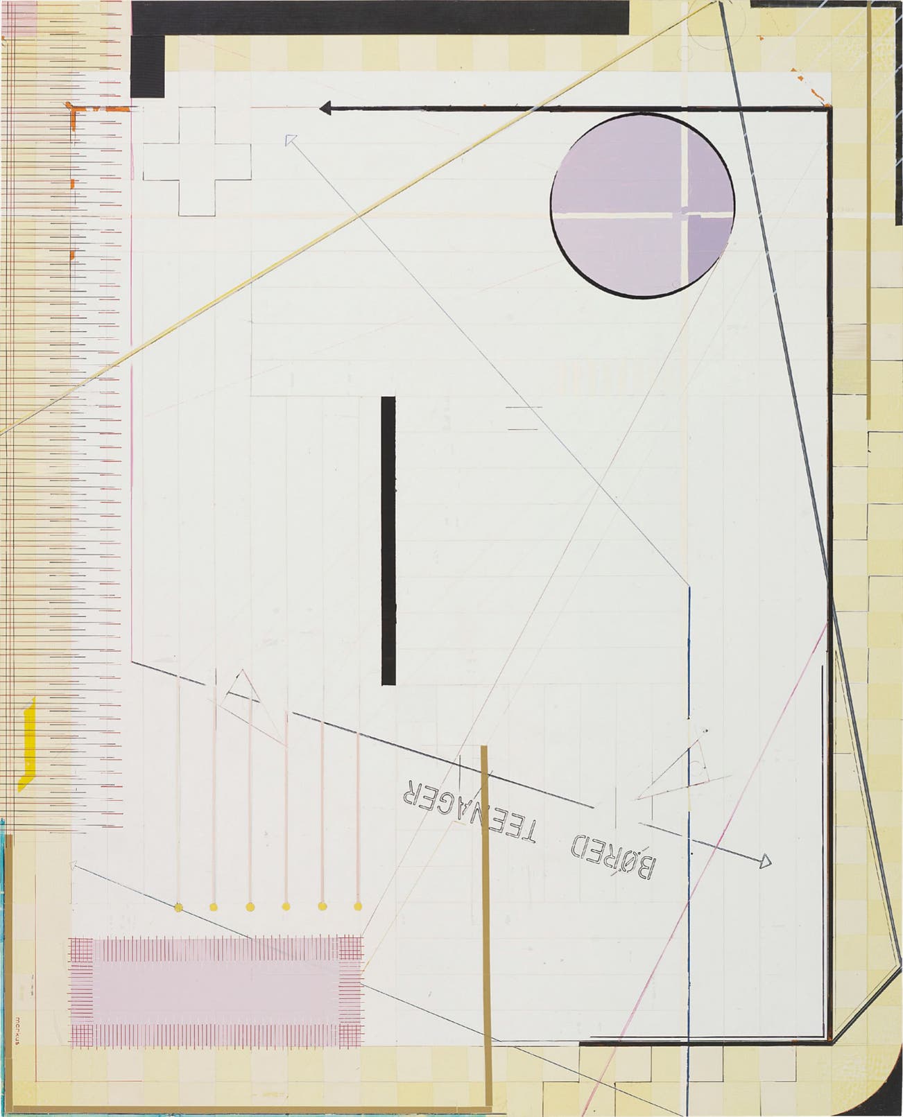 adhesive tape, enamel paint, pen, pencil on plywood
