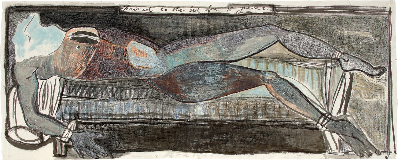 The drawing Chained to the Bed for 15 Years, made in 1986-87, marks a significant moment in the development of the work of South-African artist Marlene Dumas: it is the first large size work devoted to the subject of the male nude. It was included in the important solo-exhibition The Question of Human Pink in Bern, Switzerland, in 1989, where it was presented alongside several other drawings and paintings of reclining male and female nudes. The reason why Dumas’ male nudes have not attracted the same amount of attention as her female nudes can only be subject to speculation. That they deserve our attention alltogether is however without doubt.