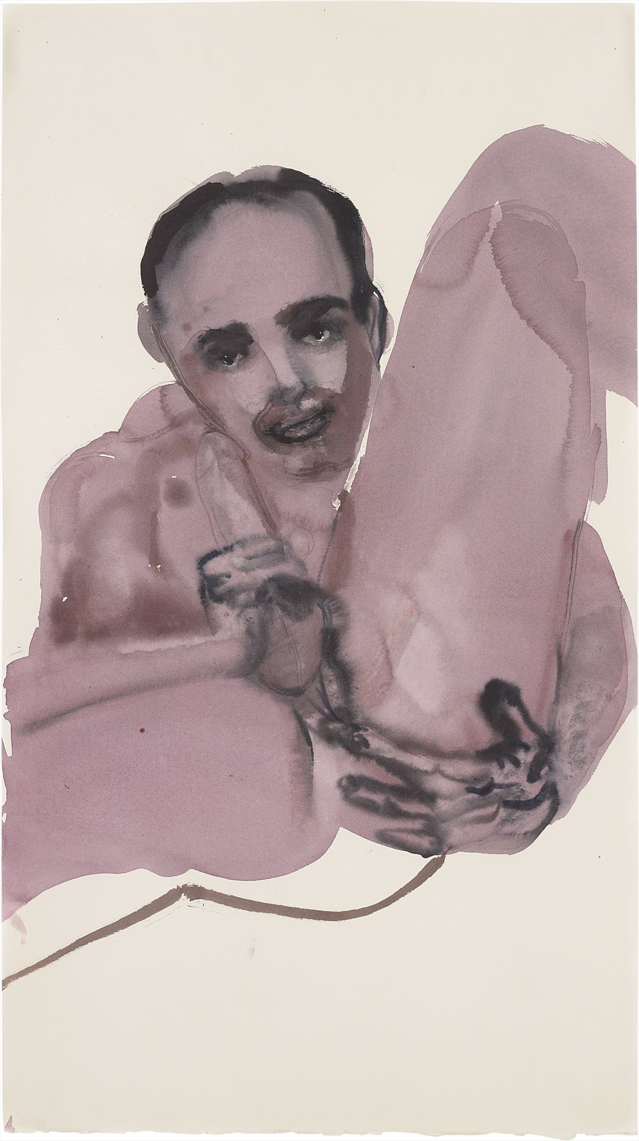 Born in South Africa in 1953 and currently based in Amsterdam, Marlene Dumas has become one of Holland’s most internationally acclaimed artists, with an oeuvre that is mostly characterised by a profound exploration of sexuality as a constituent of the human condition. Her distinctively fluid strokes of watercolours that blur the lines between painting and drawing, perfectly compliment her peculiar subject matters which have altogether led scholars to describe her style as a form of ‘intellectual expressionism’, aligning her body of work with other significant artists such as Edvard Munch and Francis Bacon. Rather than conventionally feeding of of real life moments, the artist deals “with second-hand images and first hand experiences” (Marlene Dumas, Sweet Nothings, ed. Mariska van den Berg, Marlene Dumas/Galerie Paul Andriesse/Uitgeverij De Balie, Amsterdam, 1998, p. 24). Working almost exclusively with photographic sources, often polaroids, that the artist has either taken herself or acquired from outside sources like newspapers, enables Dumas to capture accurate moments that reveal a raw truth.