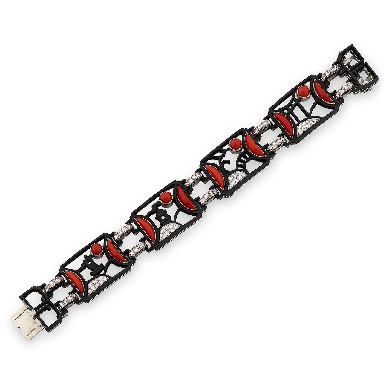 Of openwork design, each panel depicting a Japanese landscape in blackened steel, embellished with polished coral and circular-cut diamond accents, length approximately 155mm, signed Marsh's.