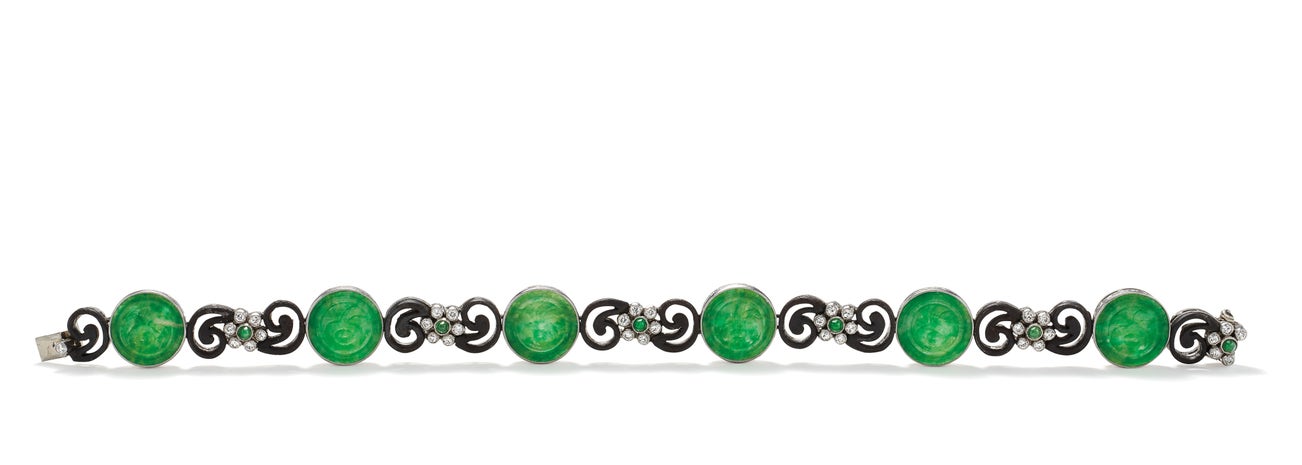 An Art Deco Jade, Diamond, Platinum and Steel Bracelet