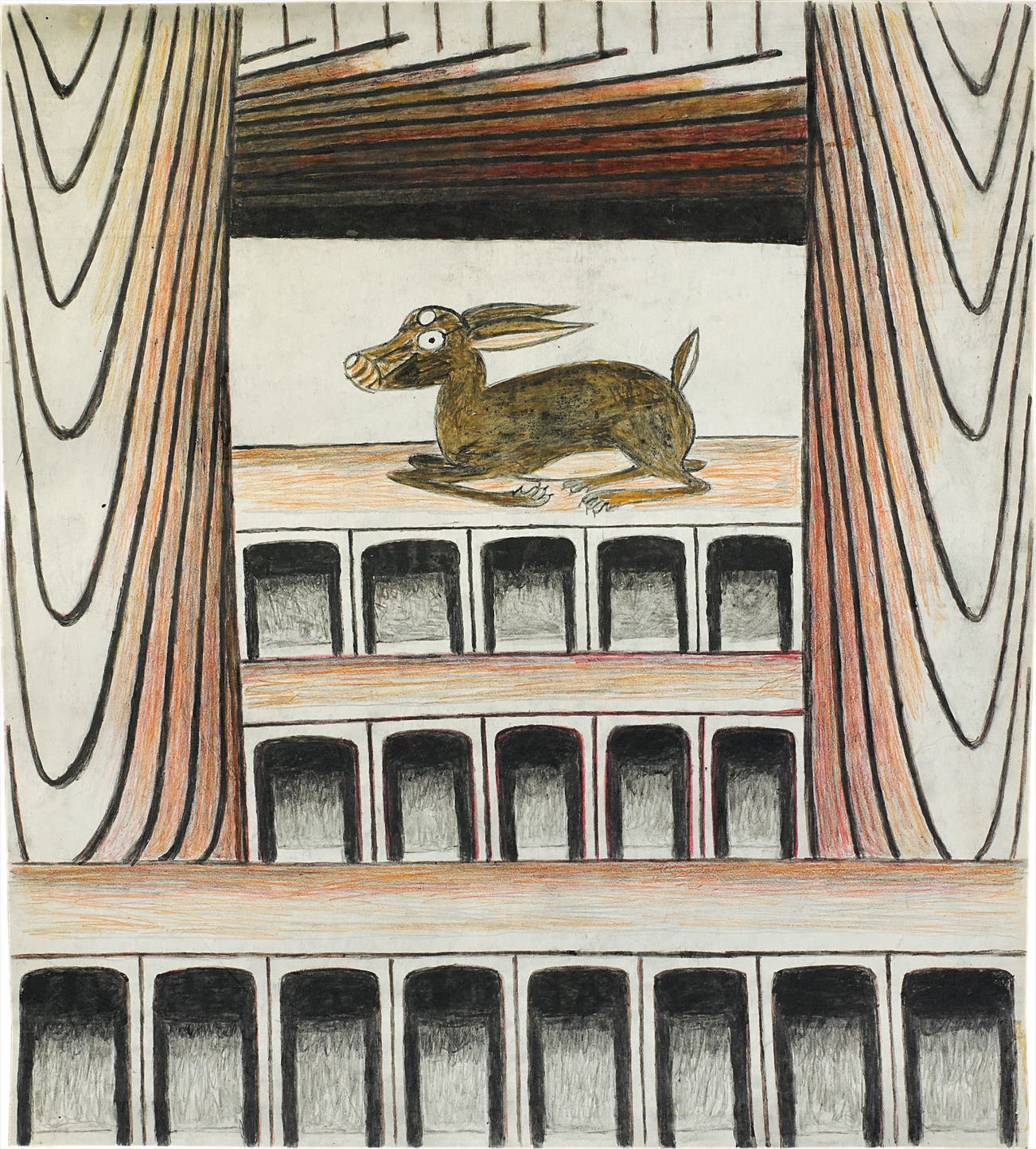 Martín Ramírez left his hometown of Jalisco to move to the United States in 1925 in search of work. Found later on the streets of a California city, homeless and unable to communicate, he was committed to a psychiatric hospital. Ramírez was diagnosed as a catatonic schizophrenic and spent the rest of his life in different psychiatric wards in California. During this difficult period, he produced an impressive body of drawings that allowed him to express himself and the world in which he found himself trapped. He began with pencils that were given to him by the hospital staff, and then slowly he started incorporating scraps of paper, which he glued together with a variety of substances such as mashed potatoes, bread, water and saliva. During the 1950s, a professor from Sacramento State College named Tarmo Pasto, who was at the time investigating mental illness and creativity, was impressed by Ramírez’s talent and began promoting his art. Although Ramírez is often categorized as an outsider artist, his work has influenced notable artists such as Wayne Thiebaud. Ramirez’s drawings introduce us to a series of noteworthy characters and scenes that document his life experiences. He depicted mounted caballeros, Mexican Madonnas, cowboys and a variety of astonishing animals, such as the fawn in the present lot. An indelible aspect of his work is the unique concept of pictorial space that Ramírez evokes through an arrangement of curved and parallel lines, giving viewers the illusion that space is expanding and contracting. Ramírez places his characters inside this original arrangement of lines that become prosceniums and stages, alluding to themes of distance, separation and isolation. Ultimately his forms and palette reveal an exigent and complex pictorial vocabulary, which attests to his genial draftsmanship and remind us that we are just beginning to comprehend and appreciate this remarkable artist’s work.