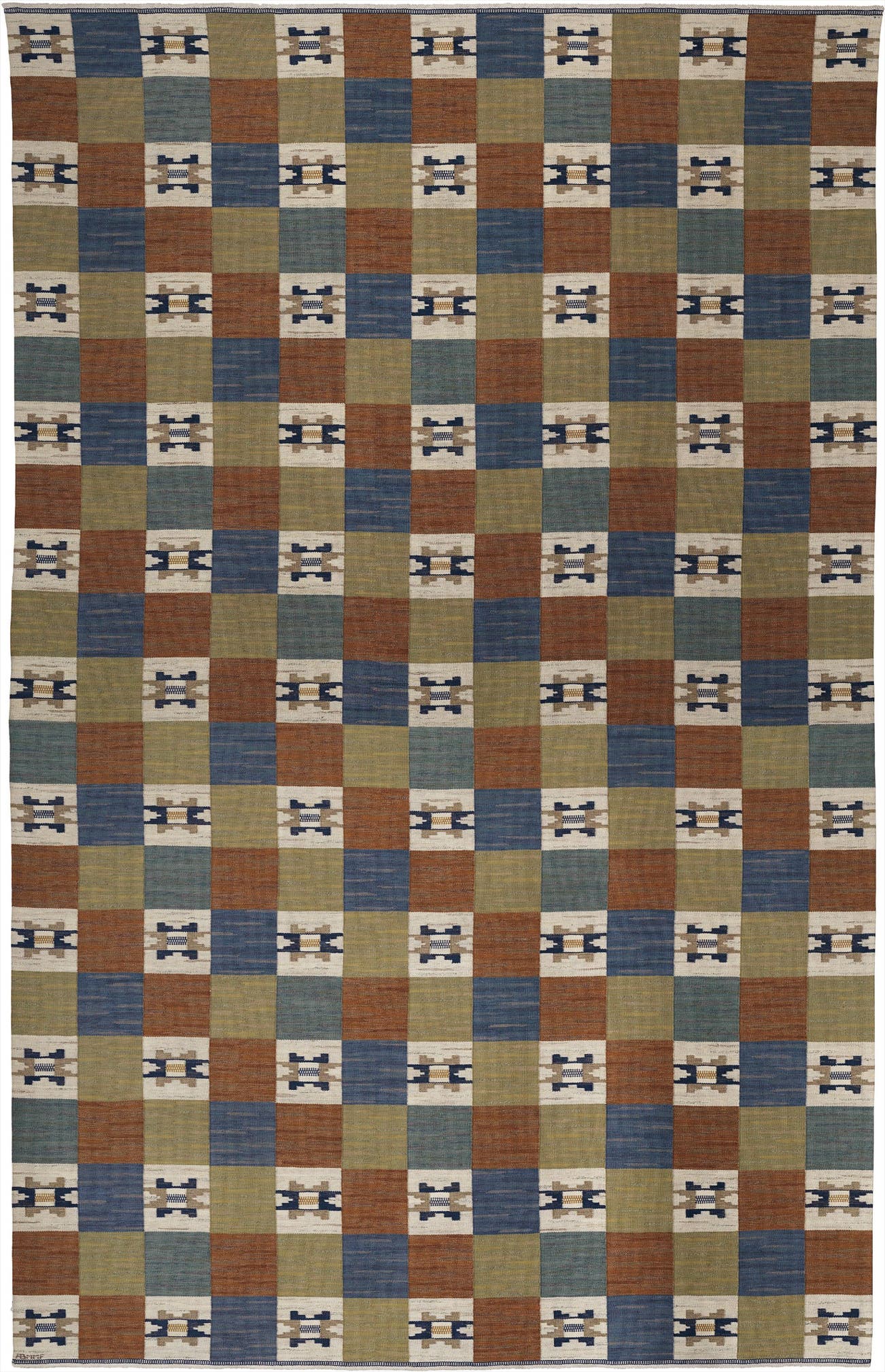 Produced by Märta Måås-Fjetterström AB, Båstad, Sweden. Woven with manufacturer’s mark AB MMF.
