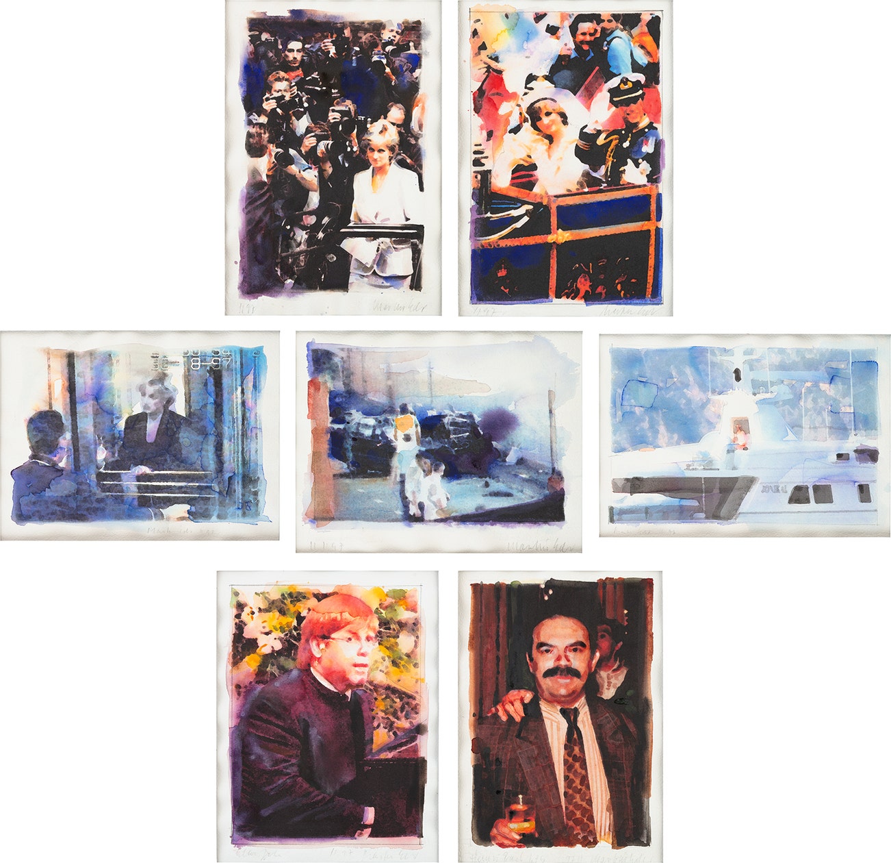Seven works: (i) Diana and Charles; (ii) Diana and photographer; (iii) Yacht; (iv) Driver and Diana; (v) Diana at Hotel; (vi) Elton John; (vii) Crash from the series Diana and Charles