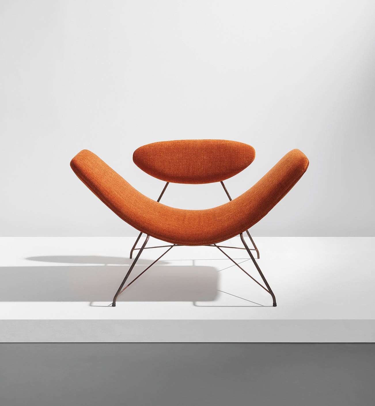 With a grinning profile that transforms into a smirk, the present model Reversível armchair is an ingenious and comical take on the concept of an adjustable armchair. The construction is similar to Franco Albini and Ezio Sgrelli’s design for the adjustable Gala armchair (lot 12): each chair is adjusted by lifting the curved seat and placing it at the desired pitch on its conforming base. Materially and stylistically the armchair is purely of the 1950s, and its unique design reflective of Eisler’s innovative work for Forma.