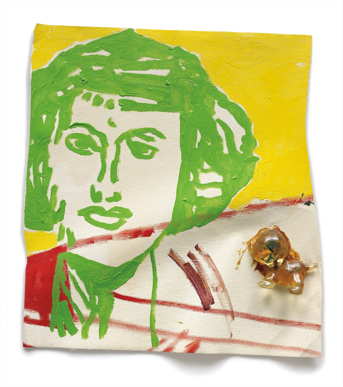 Oil painting in colors with plastic dog and cigarette butts, on unstretched shaped canvas.