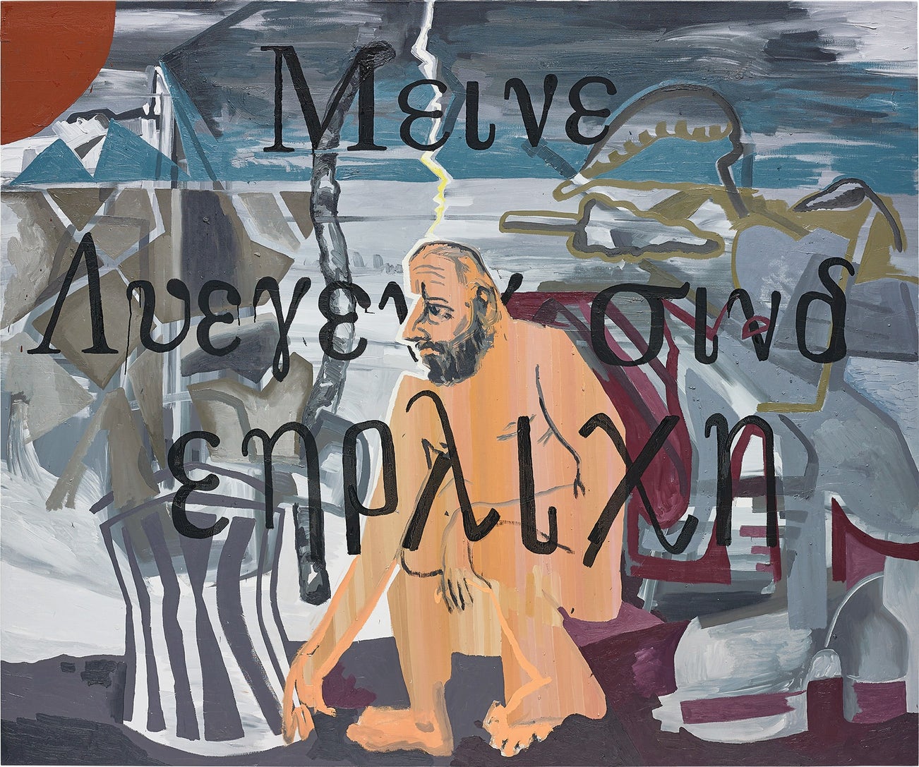 Within Kippenberger’s cycle of 36 works, the artist frequently incorporates classical references, underlining the rich influence of Greek antiquity on the origins of Western art history. Through the inclusion of Grecian architecture, mythological sources, poses garnered from Olympic athletes and classical statues, and the bold overlaying of Greek text, the artist anchors his composition to the Greek Island of Syros and the classical tradition. In the present work the text is transliterated, the phrase can be understood as a phonetically written German sentence: Meine Luegen sind ehrlich (my lies are honest ones). Placing what would appear to be a broken column at the fore of the composition, just within reach of his classical, athletic stature, Kippenberger alludes to the virtue of fortitude, a subject often employed by Renaissance artist’s to symbolise courage in times of pain or adversity. In another reading, the pedestal like column reveals itself to be a metal bin alongside the artist’s hunched, vulnerable and ungainly posture.