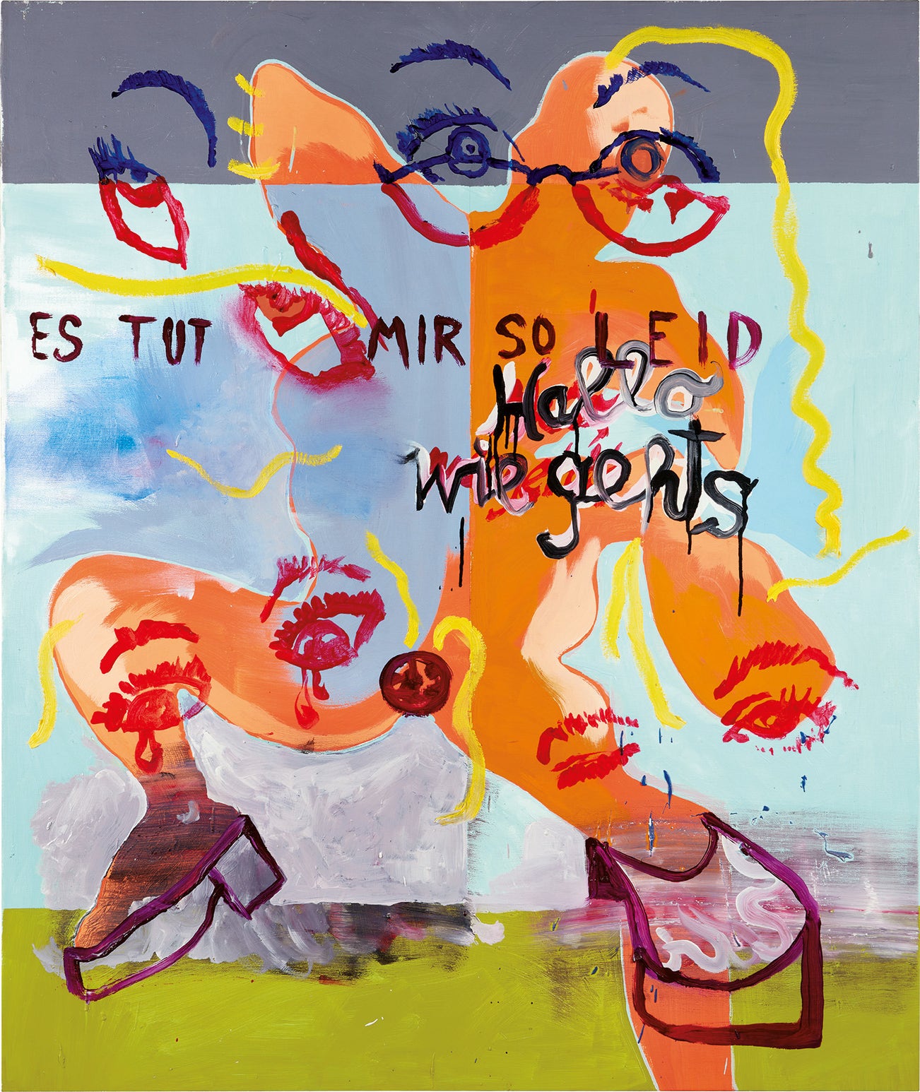 Throughout his practice, Kippenberger utilized a wide range of source material such as stamps, newspaper articles, and postcards. The present work is unique in that Kippenberger sourced both the imagery and text from a single sticker sheet, which was comprised of stickers with different pairs of eyes, exclamations and text passages. Extracted from one foil, the images in Untitled are enlarged, dispersed and layered throughout the composition in a seemingly haphazard manner. The German phrase “Es tut mir so leid” is inscribed across the canvas, translating to “I am very sorry.” Culled from the same source, the teary eyes and text elucidate one another, providing a contextual framework through which we can begin to understand Untitled.