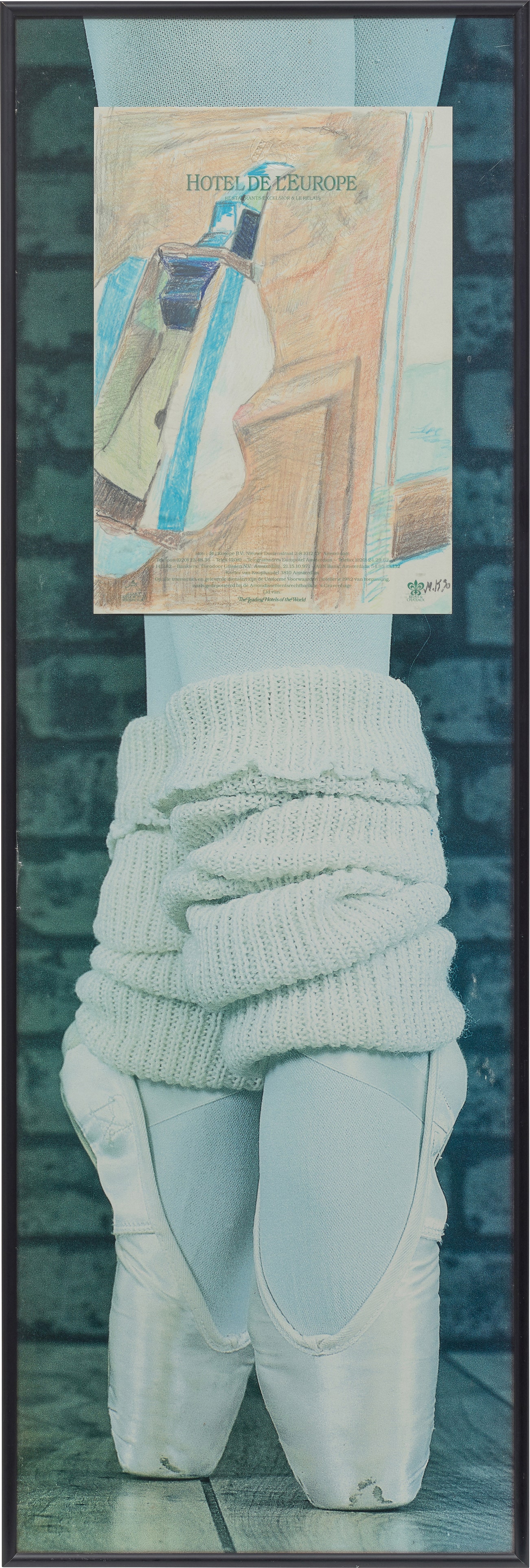 signed with the artist's initials and dated 'M.K. 90' lower right of the hotel stationary paper collage
