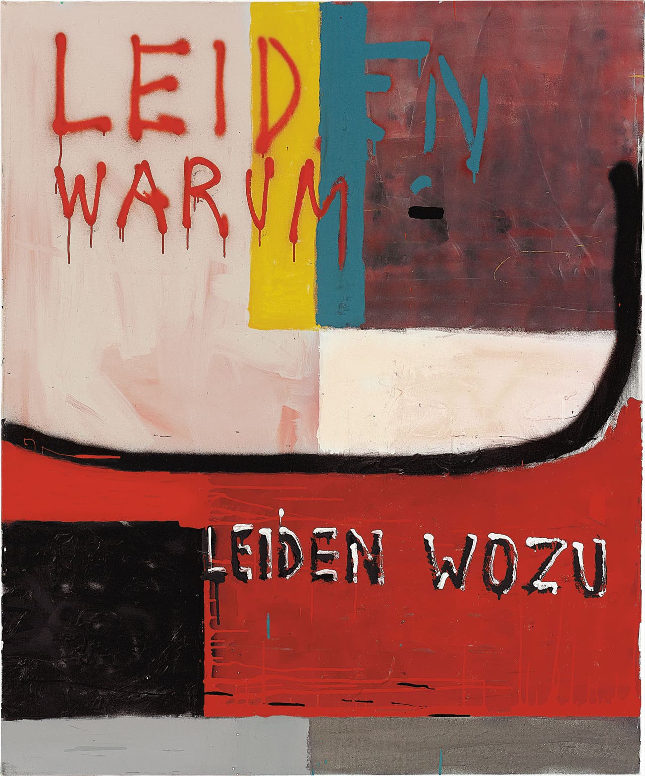 Covered in blocks of oil paint, Kippenberger’s surface is a pastiche of many influences without being indebted to any singular style. Though his huge swath of crimson bordering black and white may suggest Color Field painting or perhaps the Neo-Plasticism of Mondrian, any effort to categorize Kippenberger would be, of course, in vain. His greatest achievement in the present lot is suggested by the painting’s title, scrawled across its surface in red, blue-green, black and white. Suffer Why, Suffer What For conjures the malaise of the creative artist and the sense of masochism compounded by the pressure of creative production. Yet Kippenberger produces the art and act of suffering in conjuring it this lamentable subject.