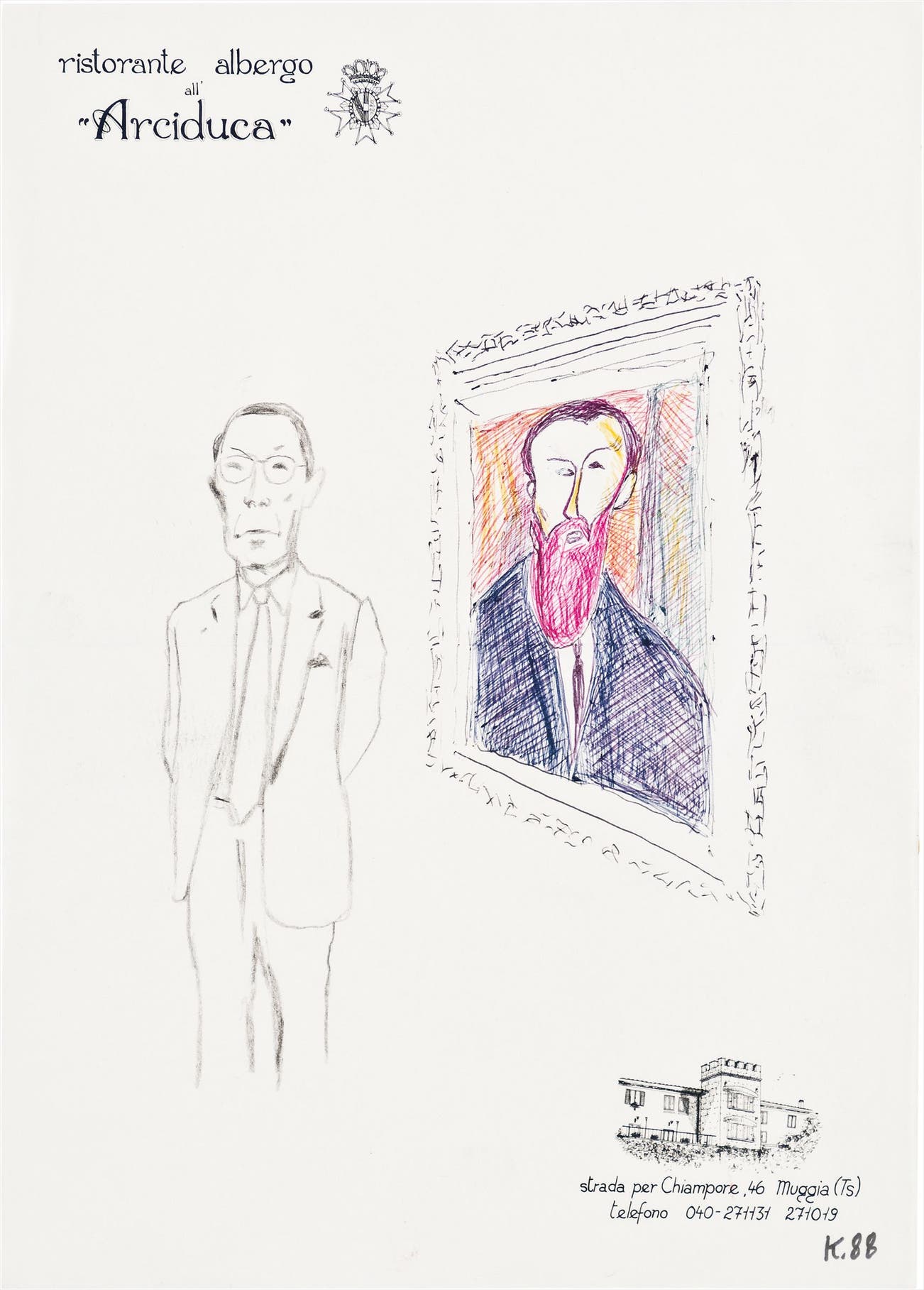 "Kippenberger made hundreds of drawings on hotel stationery, a body of work that comes across as a kind of travel diary. Although he often lived in hotels for weeks or even months, he didn’t stay at all the hotels whose notepaper he used, often picking it up from other sources. The stationery became, like so many things he encountered, a readymade material for his art." (Text from the exhibition Martin Kippenberger, Tate Modern, 2006. Curated by Jessica Morgan, Curator, Contemporary Art, Tate Modern and Doris Krystof, Curator, K21, Düsseldorf).