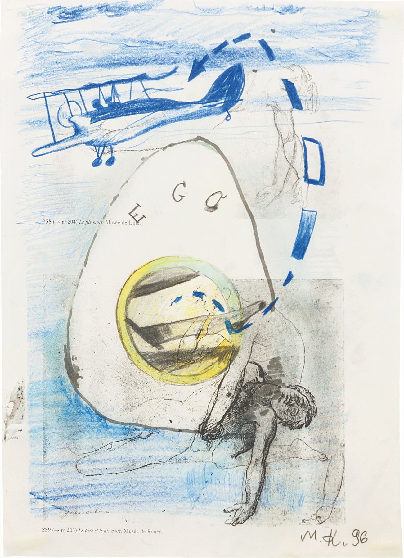 In the present lot, the artist can be seen in both a state of death and resurrection. The precisely rendered figure lies lifeless beneath the egg’s yellow, yoke center, which also acts as a portal into the center of the egg. The word “EGO,” close in spelling to the word “Egg,” is executed in graphite and can be seen inscribed on the upper arched surface of the white egg shell. The egg, floating on a blue sea, resembles a space capsule returned to earth. Kippenberger is humorously and hauntingly tying the artist’s sense of self-esteem or self-importance to the egg’s traditionally symbolic power of re-birth. In the top quadrant of the composition a small blue biplane flies above, while a dashed line connects the aircraft to the interior chamber of the egg, from where the human form emerges. This “life line” connects the artist to the airborne plane, offering to pull him up from turmoil of birth and death, or to “boost his ego” and take flight up to the safety of salvation. This Selbstporträt is the very essence of Kippenberger’s genius, at once fusing the gravity and the humor of his provocative motifs into a mysterious and suggestive whole.