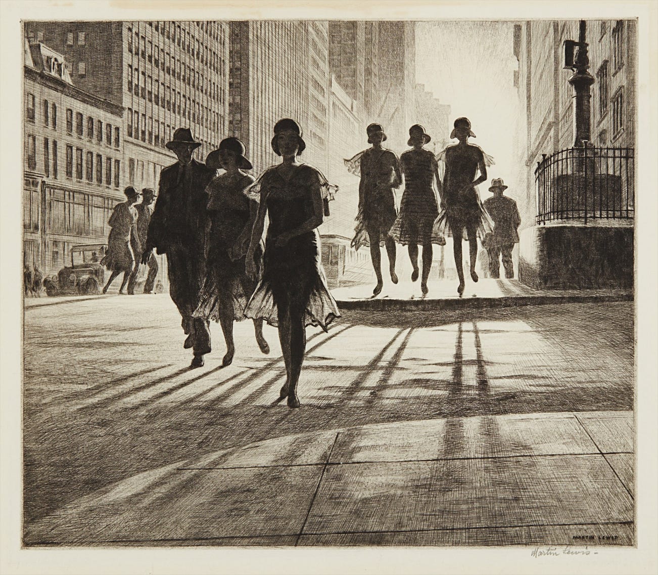 Shadow Dance may be seen as one of Lewis's most abstract prints. He all but blocked out the print's one light source, the sun, with two sets of three figures. The figures dominate the space as their shadows and the diagonal perspective lines of the buildings radiate around them, forming kaleidoscopic patterns.