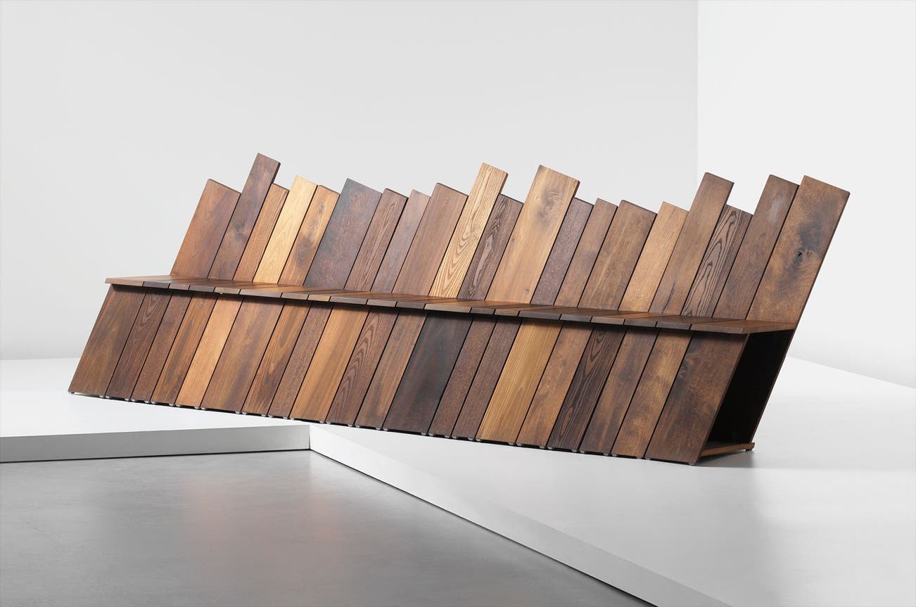 The ‘Infnity’ bench is inspired by the Italian concept of autoprogettazione (translated as self-made). Brought to life by Italian designer Enzo Mari, it aims to produce superior quality, functional furniture with materials in one’s own house. Designer Martino Gamper’s interest in this concept led him to create a work, which celebrates colour, texture and shape through the use of diferent hardwood species. With the support of the American Hardwood Export Council, Gamper has designed a highly functional outdoor bench, featuring a sophisticated patchwork pattern.
