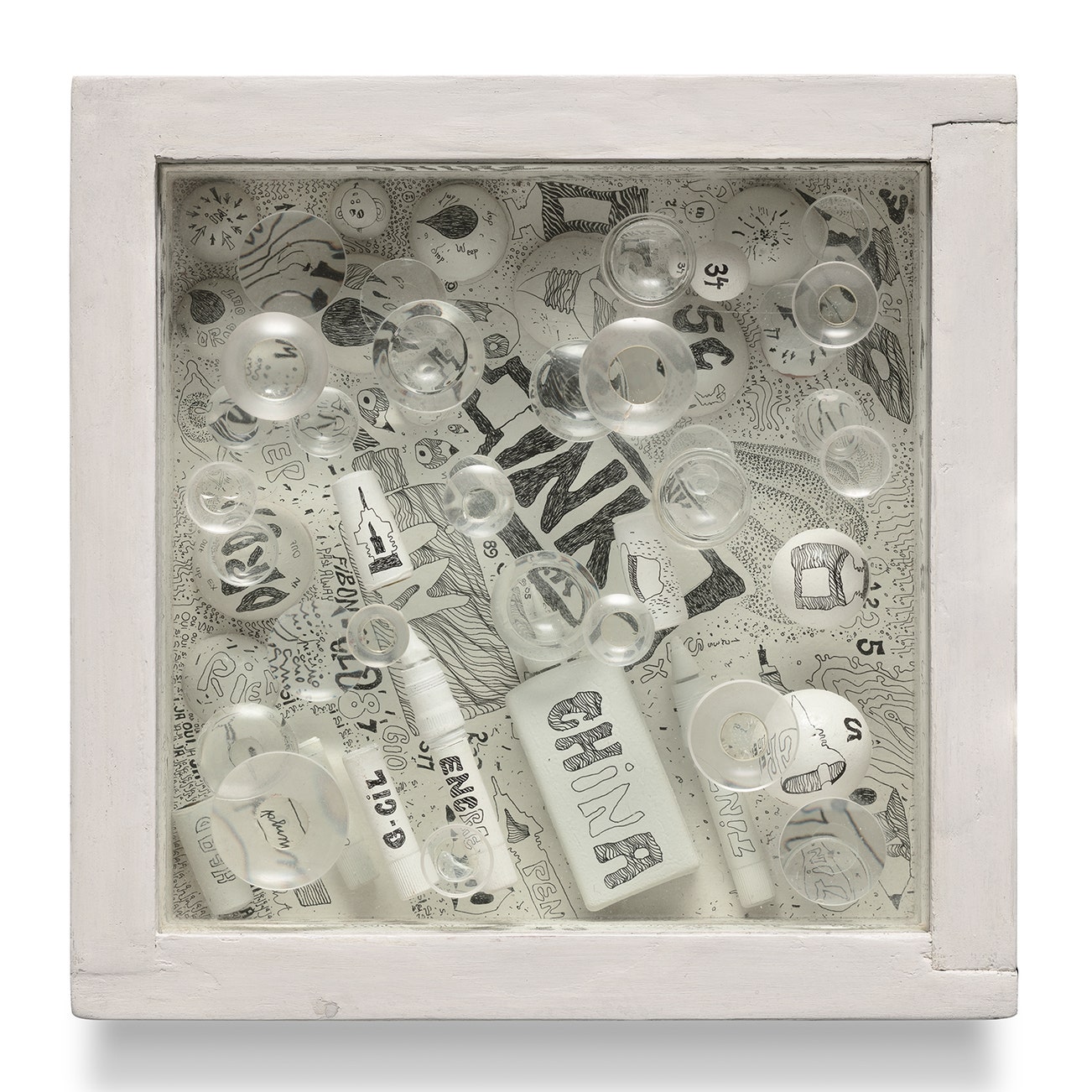 ink, glass, glass lens, wooden sphere, pen, plastic and painted wood construction
