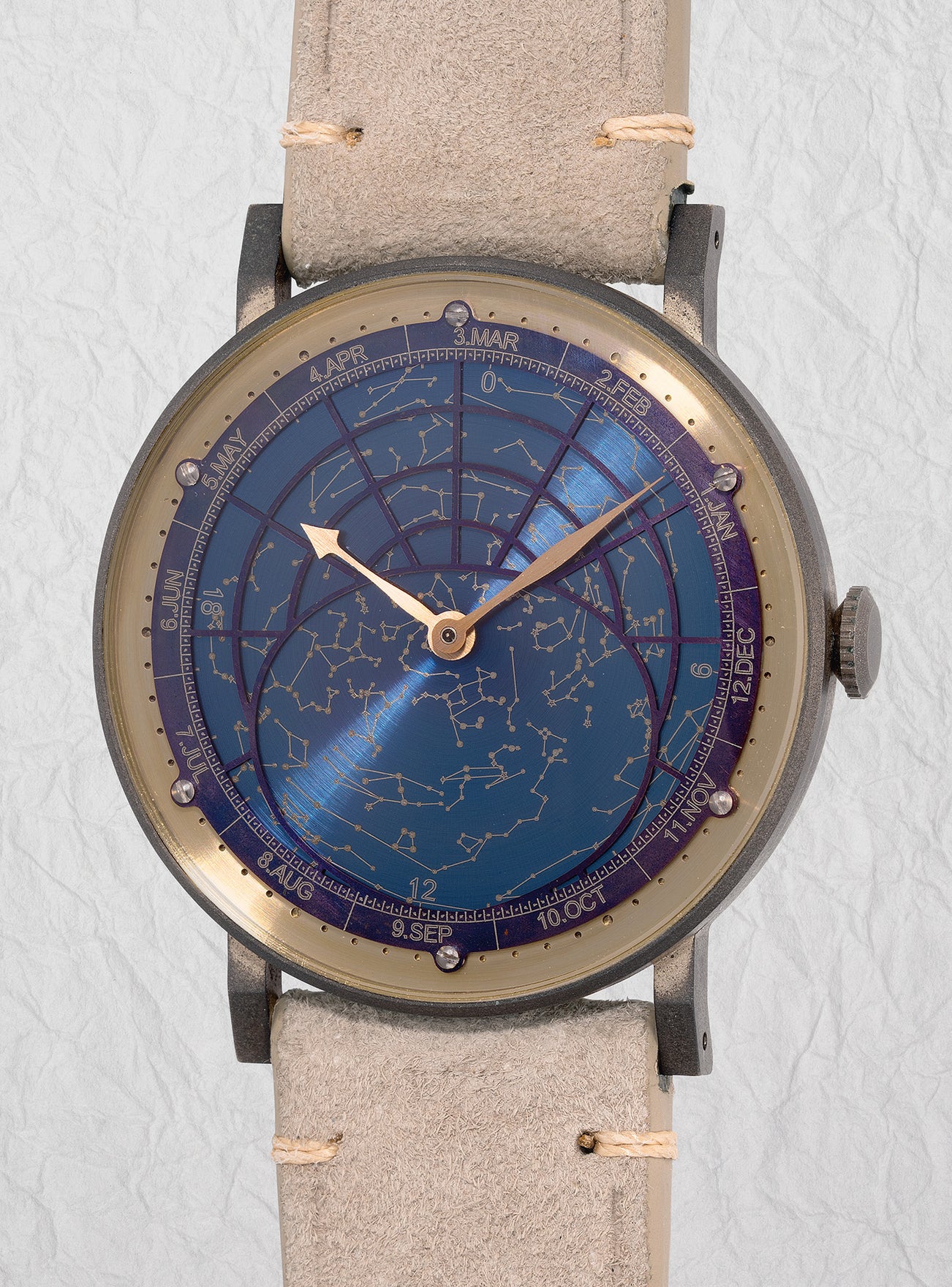 A unique and intriguing aluminum bronze wristwatch with sky chart, month indication and illustration