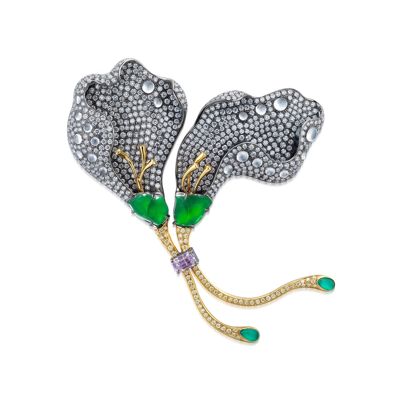 Of floral design, set with two carved jadeite plaques of intense green colour and very good translucency, petals set with brilliant-cut diamonds and icy jadeite cabochons, stems set with brilliant-cut diamonds of yellow tint, highlighted with a step-cut purple sapphire and cabochon chalcedonies, mounted in blackened and yellow gold, signed MT for Mason Tsai, length approximately 72 mm.