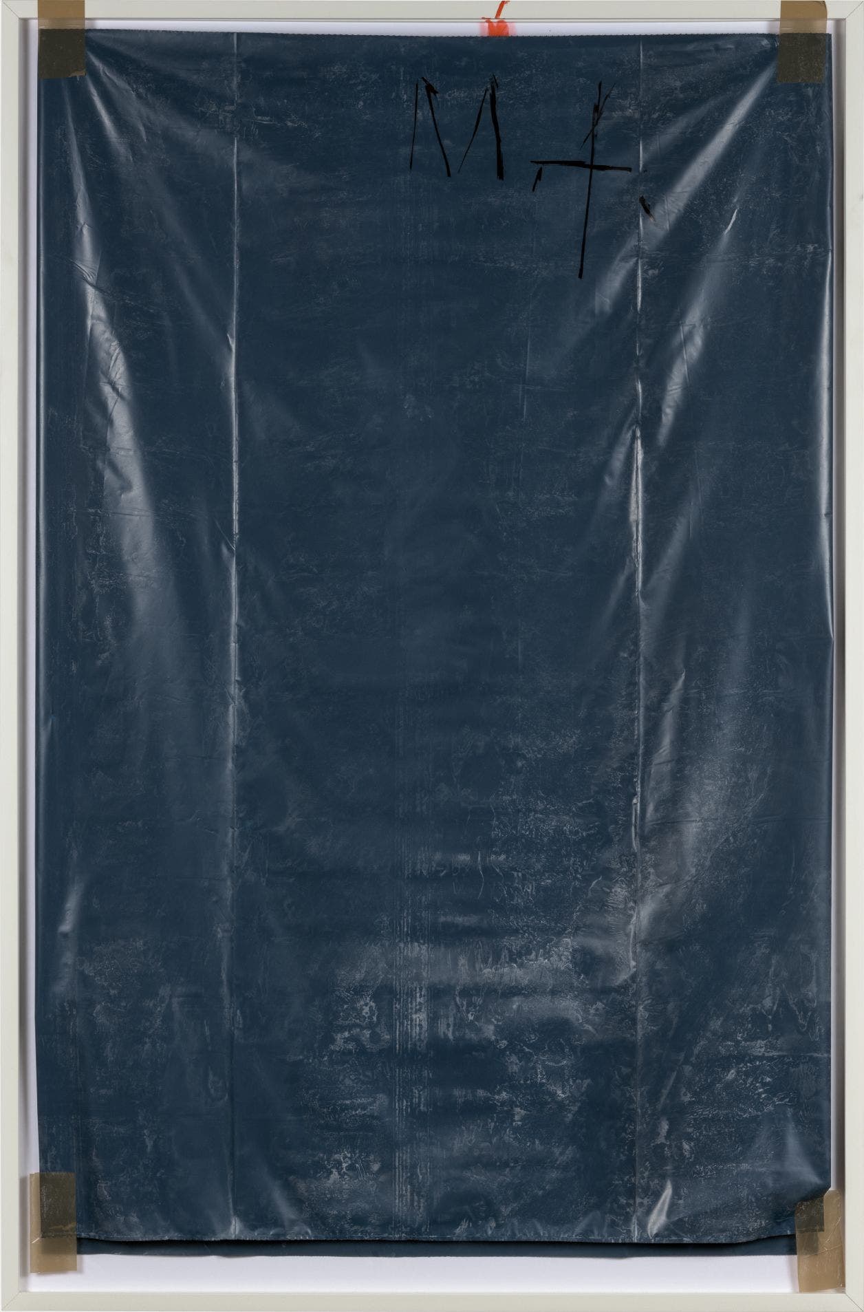 marker, pencil and fire extinguisher powder on plastic bag, in artist's frame