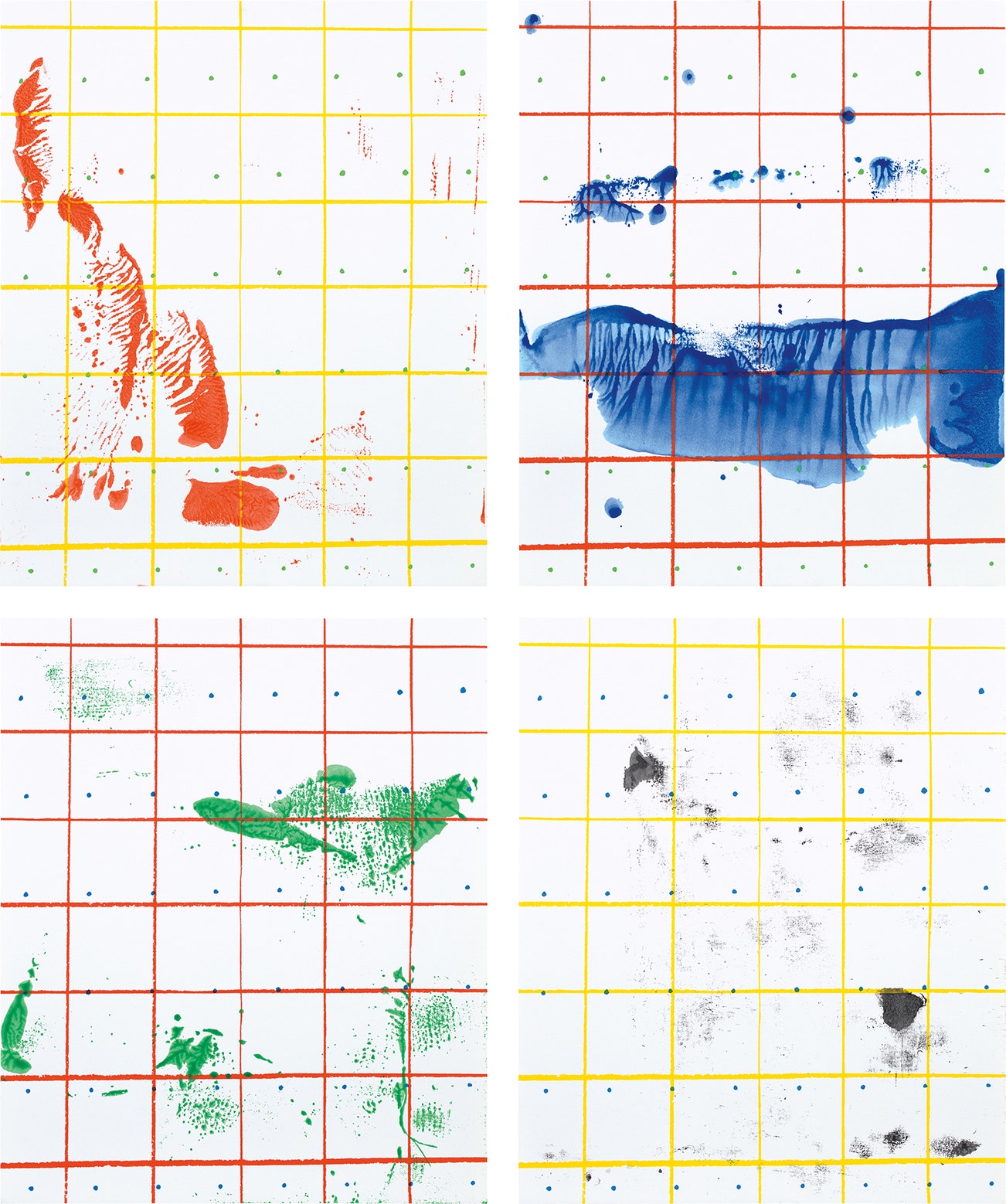 Four screenprints with hand-coloring, on wove paper, the full sheets, each with the original accompanying vinyl record Phasing Out/Happy Burnout by Phillip Sollmann, contained in the wove paper record covers.