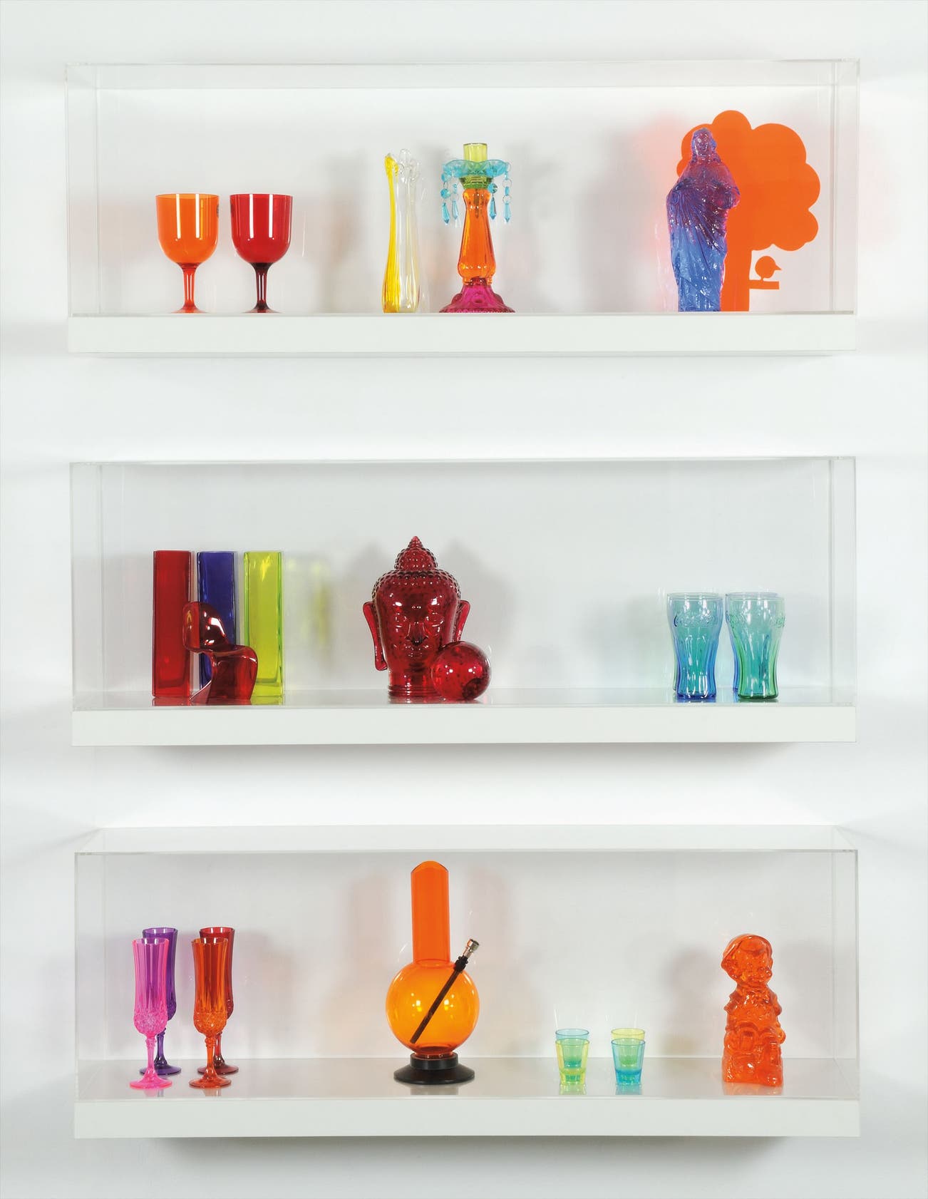 Matthew Darbyshire provocatively repackages the homogenisation of contemporary design: the moulded retro-future furnishings and CMYK colour schemes that dominate both public and private space. Democratised from minimalist couture chic to high-street decor to budget home-ware chintz, Darbyshire’s assembled objects try to define just what it is that makes candy-coloured plastic so modern, so appealing. Replicating a domestic display, Untitled: Shelves No. 5 presents a collection of purchased goods: a Verner Panton miniature and a bong, religious icons and cocktail glasses, all fabricated in the same style, the numbing yet infinitely seductive hallmark of lifestyle aspiration.