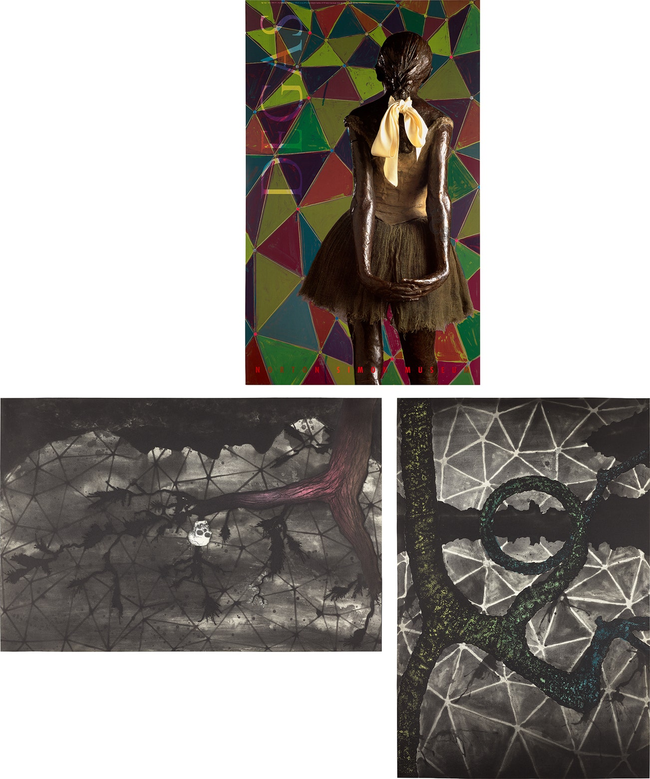 The complete set of three prints, including one screenprint in colors with collage, on found poster laminated on Coventry Rag paper, and two etching and aquatints with hand-painting, on Hahnemühle Copperplate paper, the full sheets.
