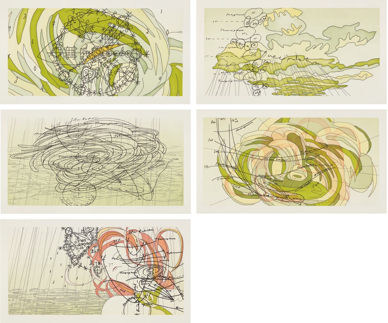 The complete set of five etchings in colors, on wove paper, with full margins.