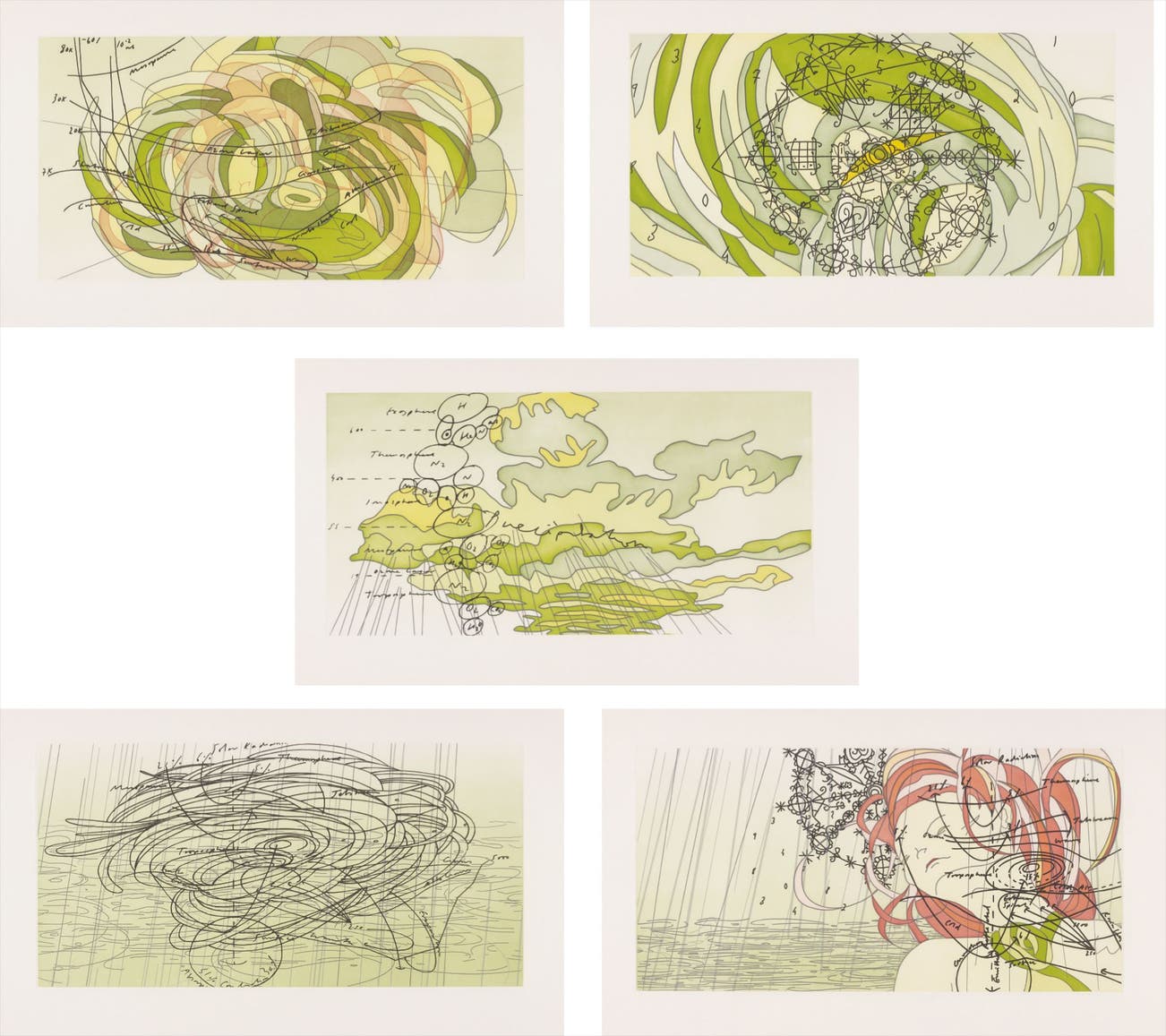 The complete set of five etchings with aquatint in colors, on wove paper, with full margins,