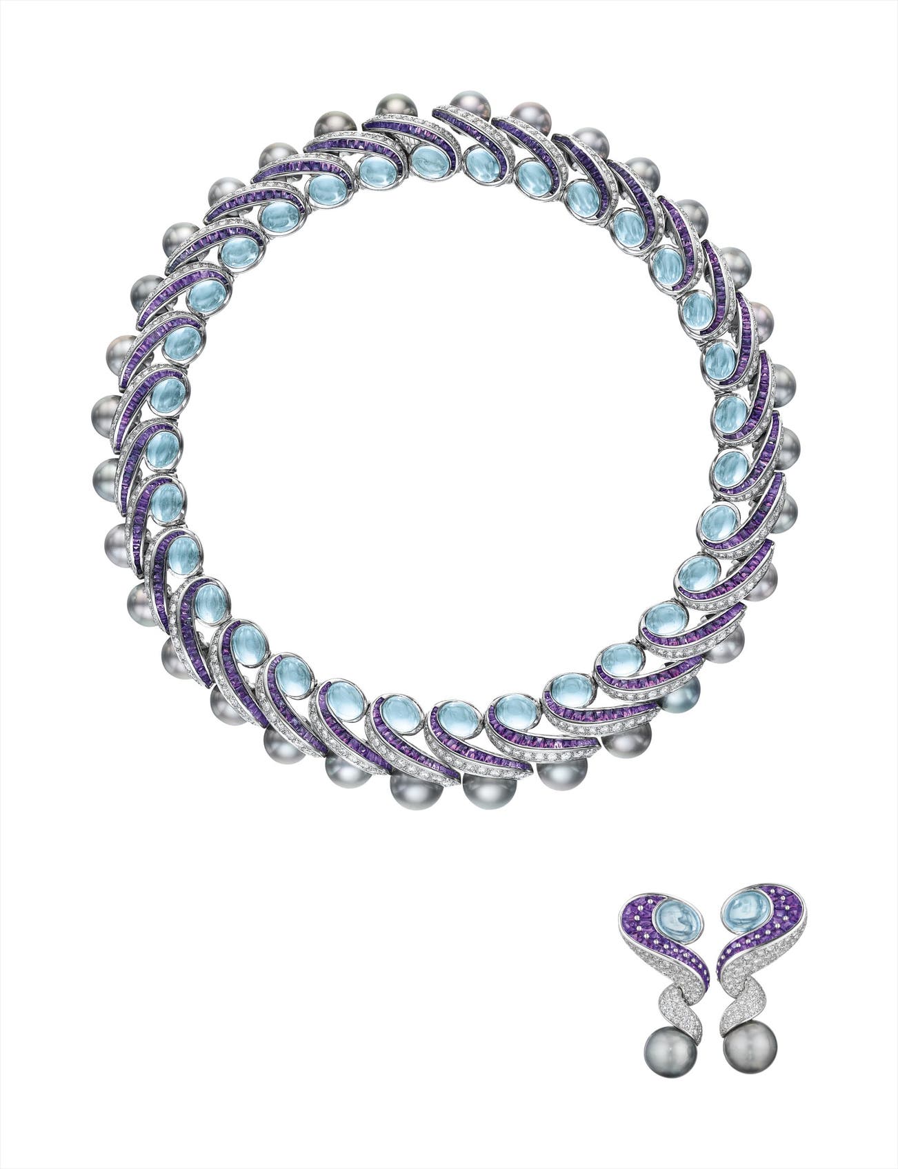 Comprising a necklace, composed of a series of scroll links, accented by circular-cut diamonds and calibré-cut amethysts, to the cabochon aquamarine and cultured pearl terminals; a pair of similarly designed ear pendants en suite, mounted in 18K white gold, necklace length 17 inches, ear pendant length 1 5/8 inches.