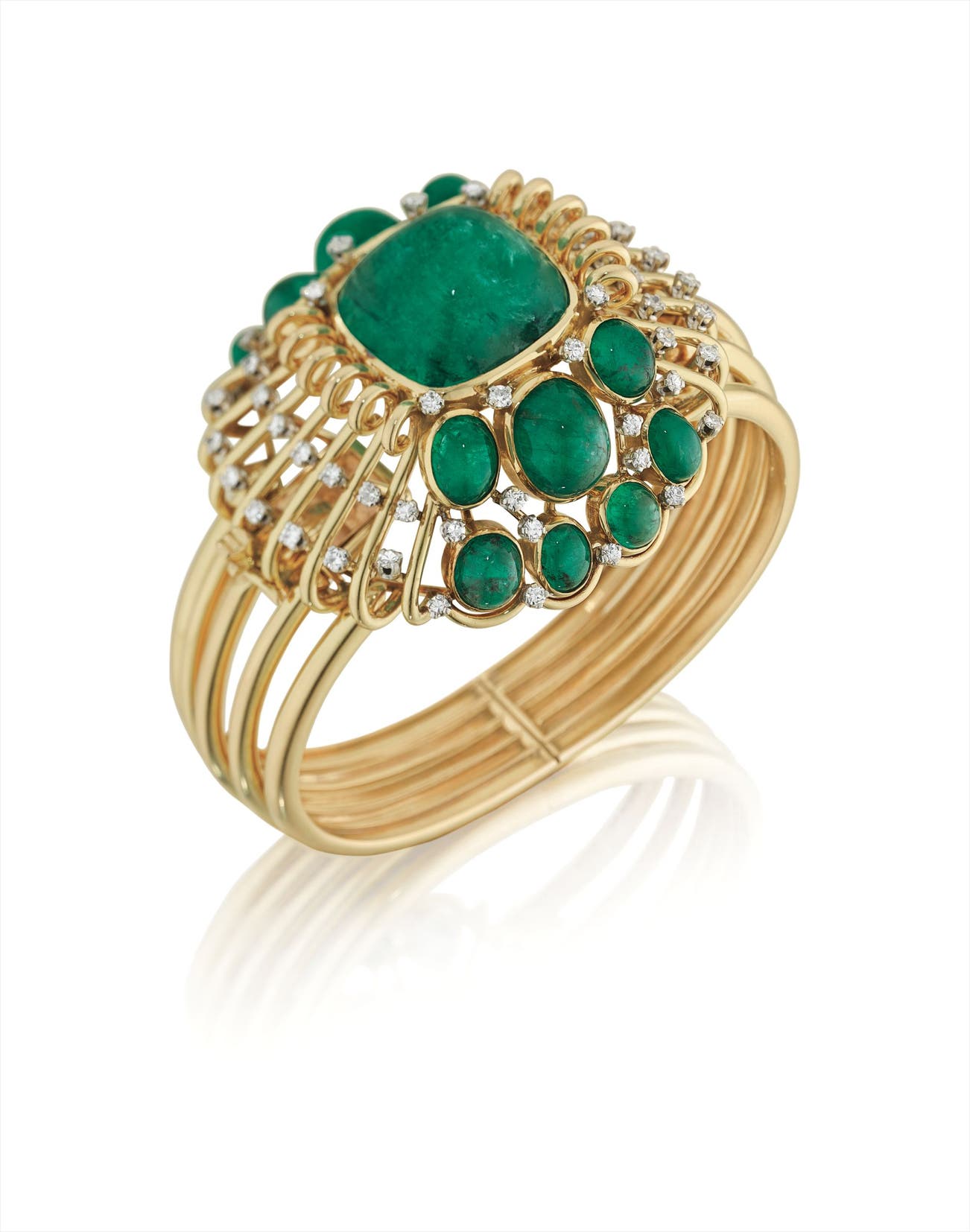 Designed as a hinged bangle bracelet, centering on a square cabochon-cut emerald, weighing approximately 34.00 carats, within a polished gold scroll surround enhanced by oval cabochon-cut emeralds and circular-cut diamonds, mounted in 18K yellow gold, diameter 2 1/2 inches.