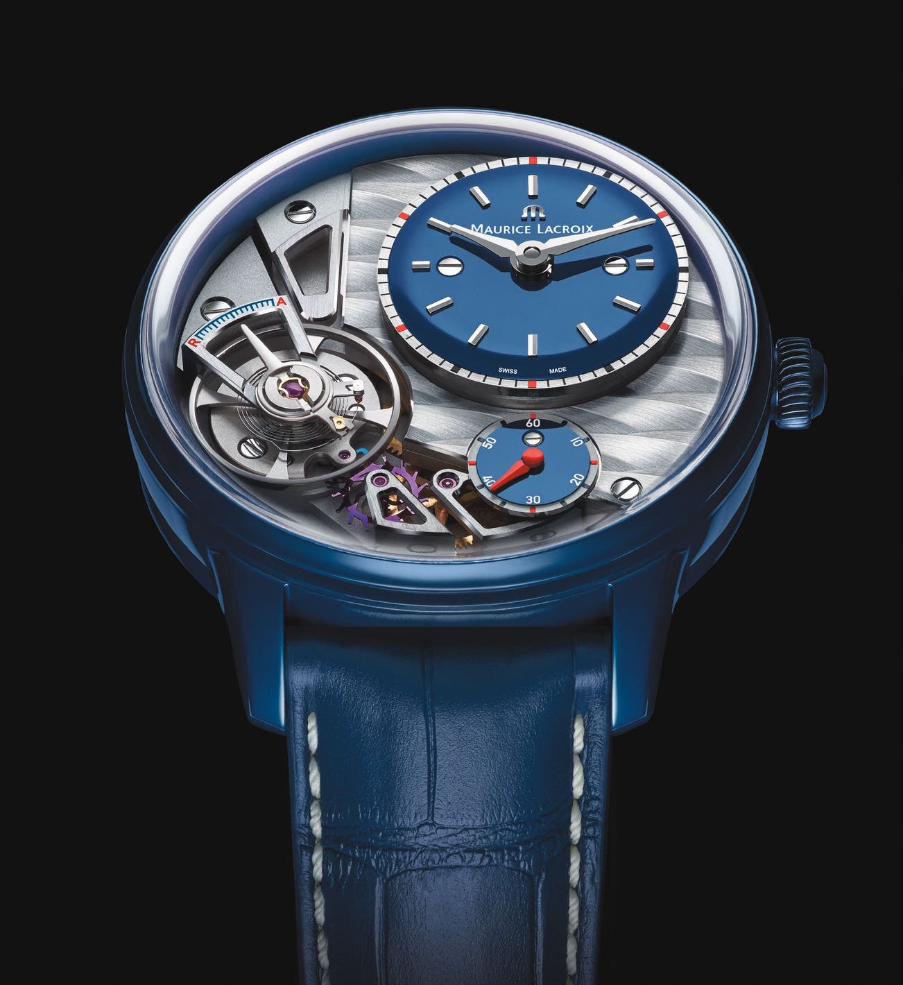 The Masterpiece Gravity from Maurice Lacroix is an innovative timepiece, at the cutting‐edge of progress: Manufacture movement, silicium assortment, world-première “Vague du Jura” decoration, high-tech POWERLITE® case and a striking, modern usage of color.