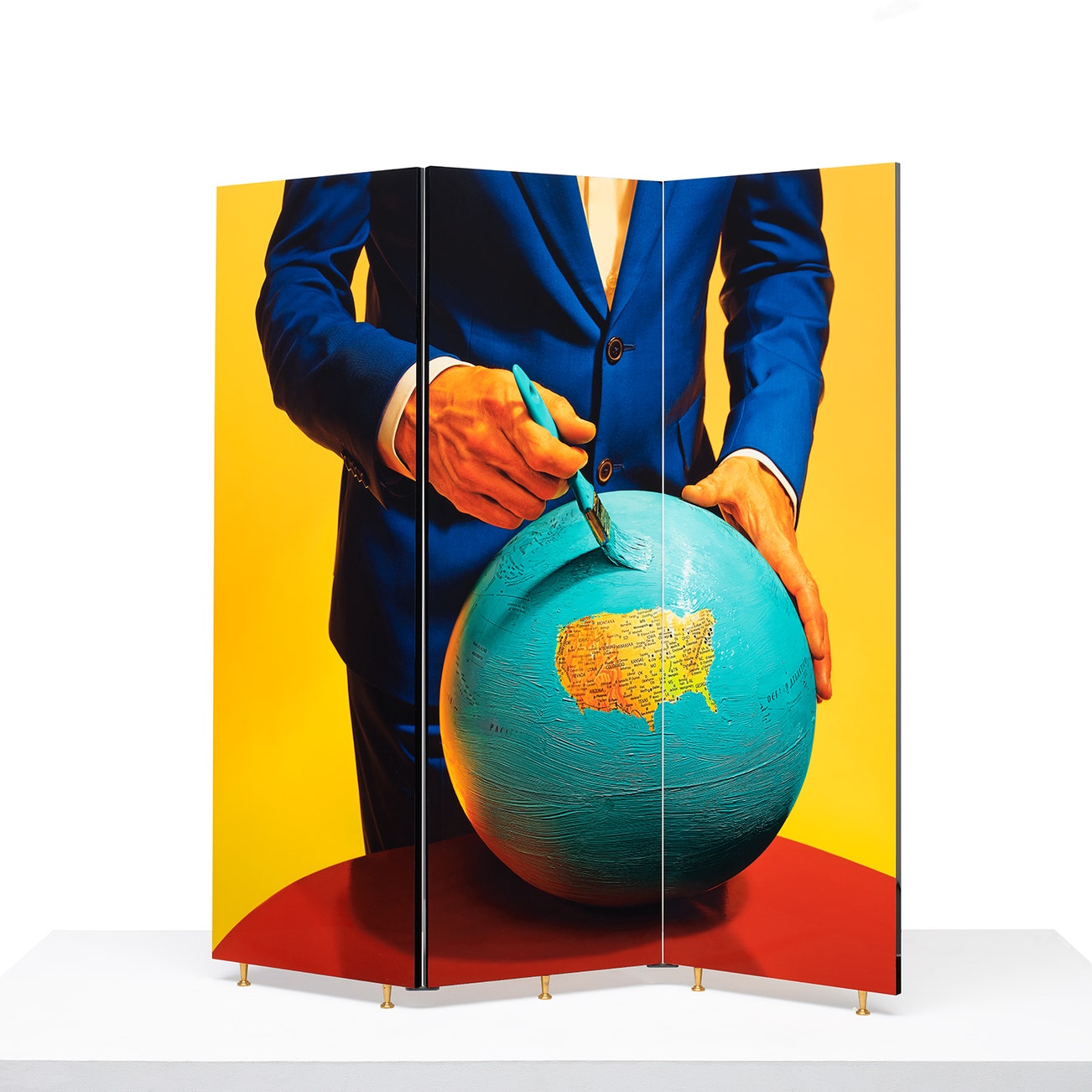 varnish and UV color print on wood folding screen with brass and metal hardware