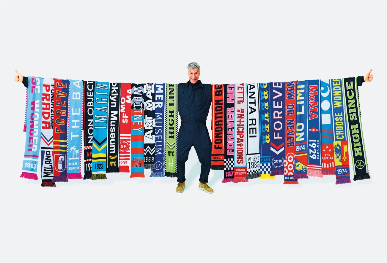 With museums increasingly acting as reference points for communities, places where a sense of identification, passion and faith take place, Cattelan looks to create an object that engages with connoisseurs and dilettantes alike and represents their passion for the arts. With Museums League, Cattelan appropriates the celebratory symbolism of an alternative contemporary space, the football (soccer) stadium. Inspired by football team scarves, Cattelan’s scarves celebrate that same sense of support and belonging, with the artist’s trademark humor and pop savvy. Each scarf encapsulates the institution defining features or “chants”.