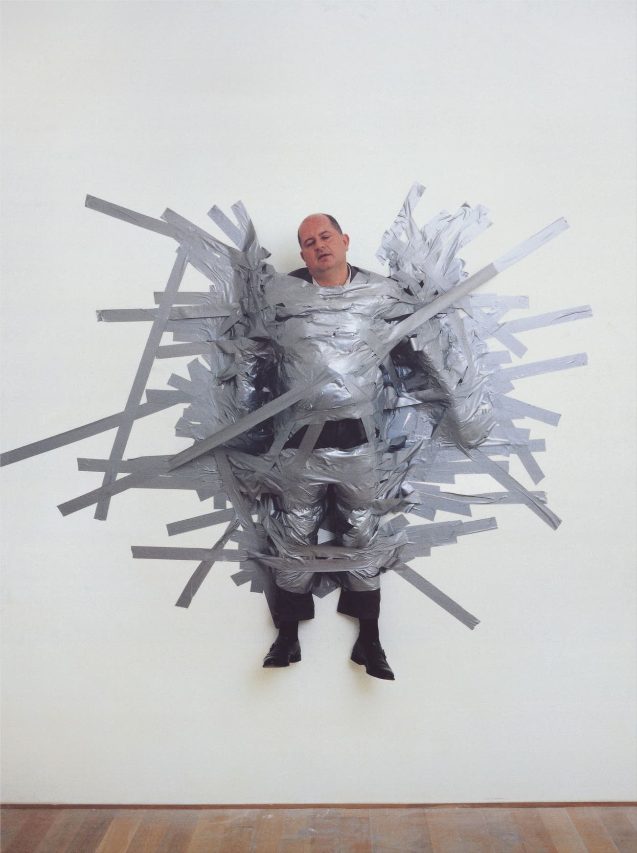 Seemingly confined within a spider-like web, de Carlo is portrayed within the bondage of silver duct tape. Suspended and unable to move free, de Carlo found himself at the complete mercy of the artist. An intentional irony is at play here, the art dealer is depicted abandoned against pure white background, eyes closed, his weary head dropped slightly to the side, gradually we begin to notice that the tape takes the form of large silver wings and, suddenly, de Carlo is transformed into an art world martyr, willfully resigned to the constraints of the artist’s intent.