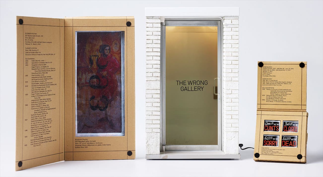Wood, brass, steel, aluminum, resin, plastic, glass and electric lighting, with accompanying copy of the Wrong Gallery Times, four boxed Adam McEwan static cling miniature window signs, and one boxed Elizabeth Peyton photo-screenprint in colours on glass with resin frame,