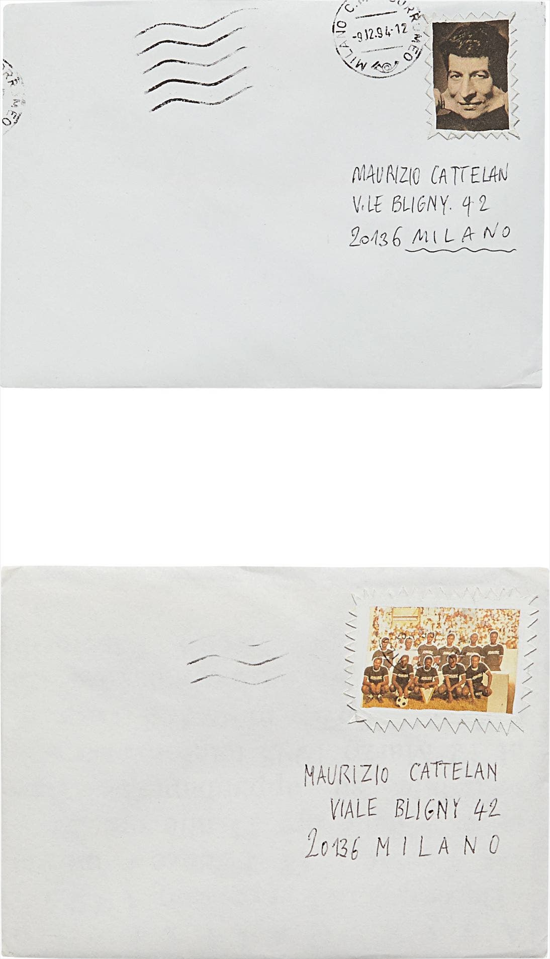 postcards, ink and artist's postage stamps on paper envelopes, in 2 parts