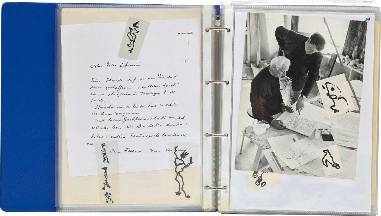 letters including correspondence between Peter Schamoni, Max Ernst, and Dorothea Tanning, illustrations, newspaper clippings, photographs and documents, in a portfolio of 57 transparent envelopes