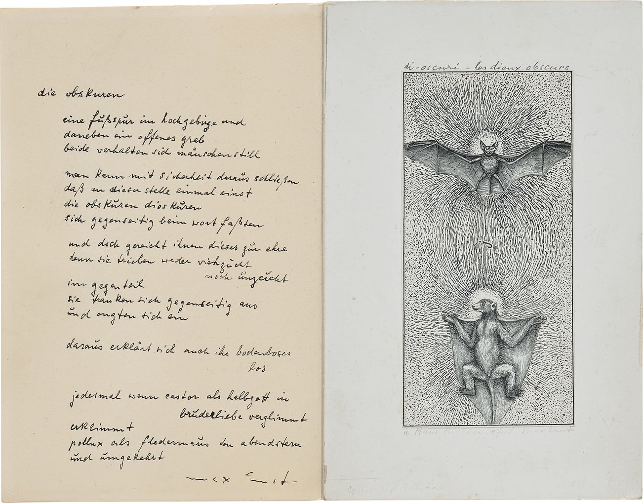 titled 'di oscuri - les dieux obscurs' upper edge; signed and dedicated 'à Hans Richter affect. Max Ernst' lower edge