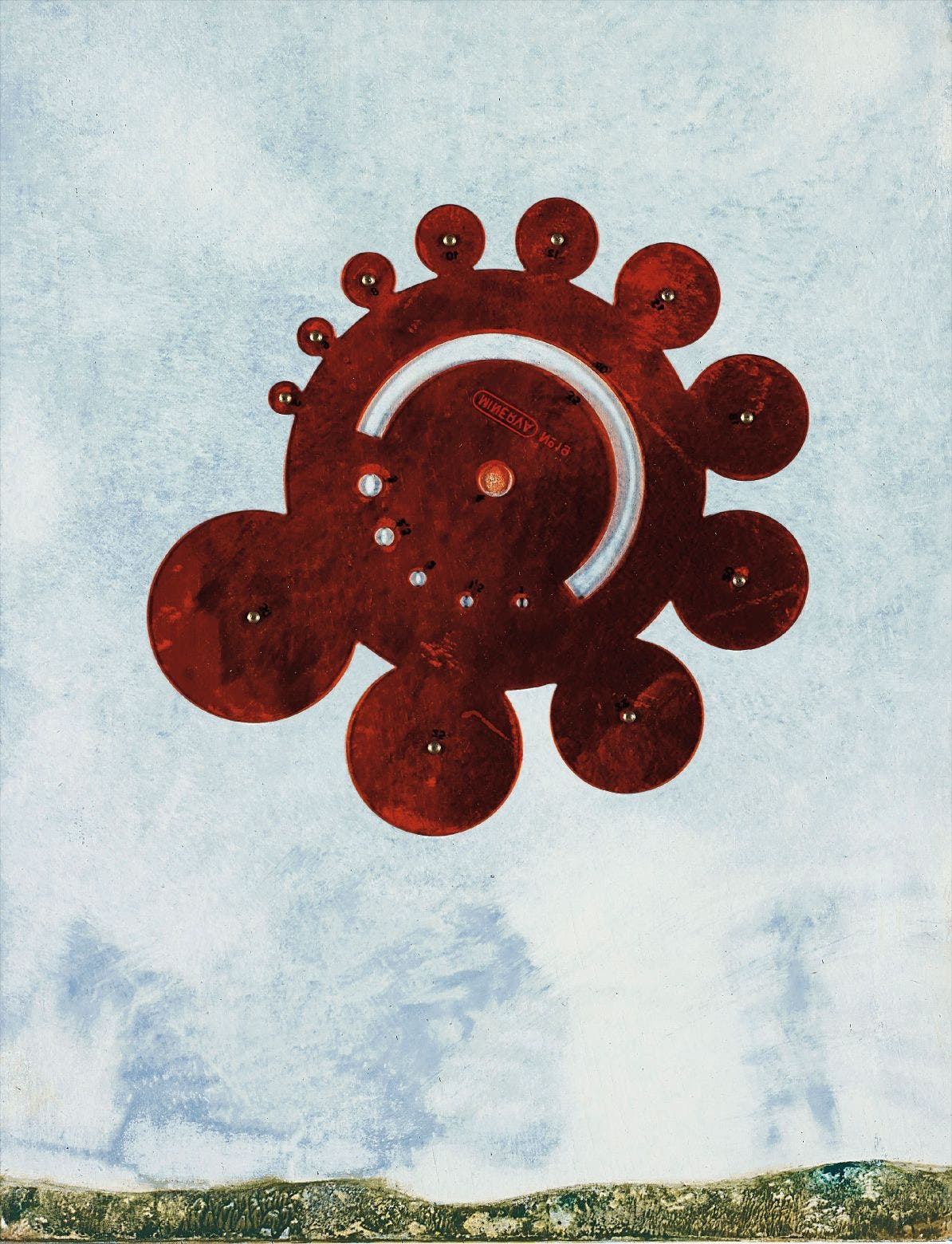 Screenprint in colours on fibreboard with collage of red plastic and nails, mounted to a black painted wooden panel (as issued),