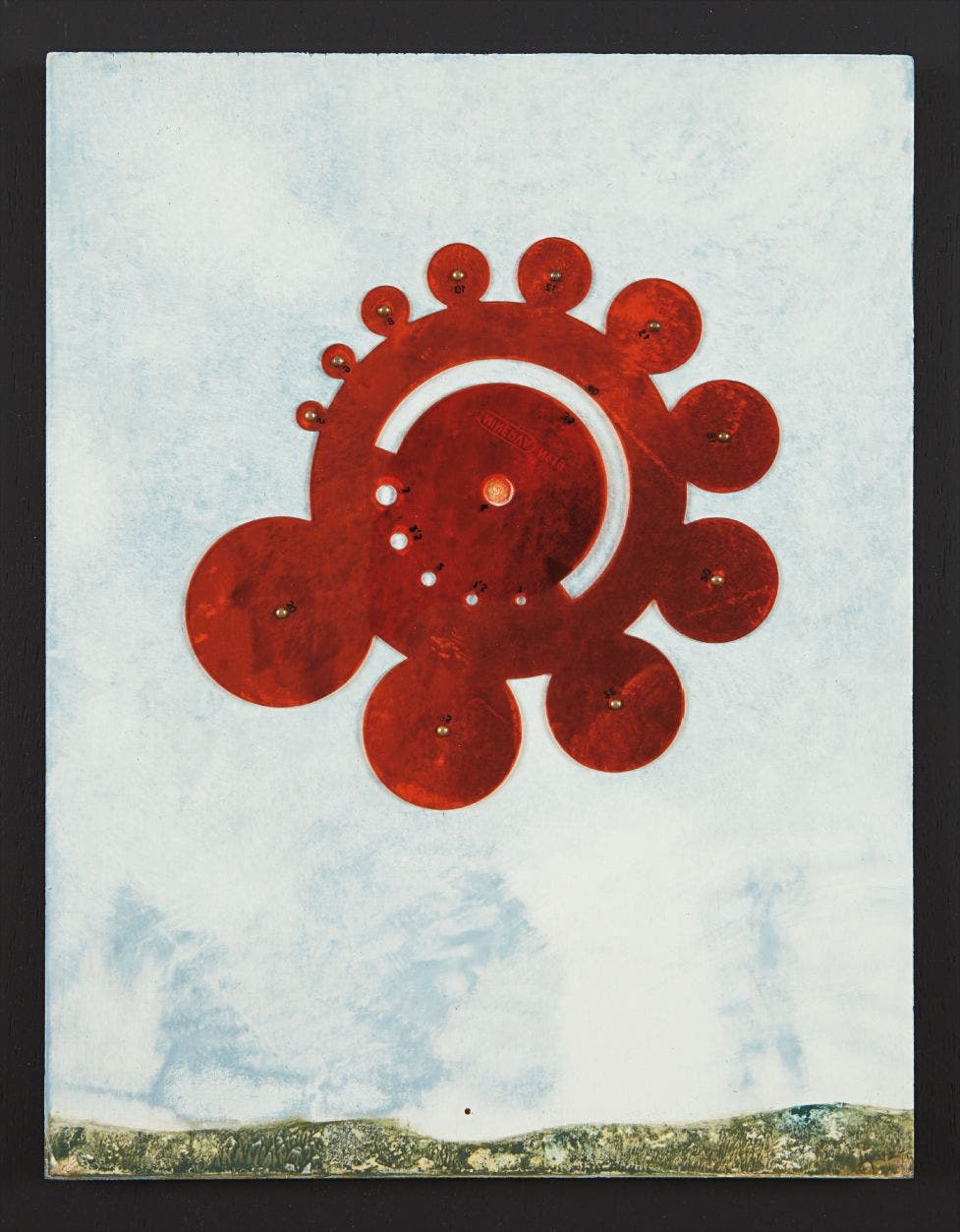 Screenprint in colors on fiberboard with collage of red plastic and nails, mounted to a black painted wooden panel (as issued),