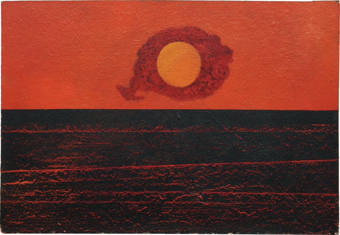Though by 1952 Ernst had moved away from the Surrealist group, the unique tactile and abstract quality of this work can be traced back to his groundbreaking practice in the mediums of painting, collage and printmaking in the early part of his career. The present lot is reminiscent of Ernst’s series of Forest and Sun works from the 1920s, which utilized his invention of frottage, a technique of rubbing paper over variously textured materials to achieve unforeseen visual effects. Ernst later applied this method to painting with grattage, which translates to “scraping”. These techniques were important contributions to the Surrealist movement and facilitated Ernst’s balance of accidental abstraction and detailed naturalism in his landscapes, a tension which preoccupied the artist from the very beginning of his career. Ernst’s unique treatment of materials instills Clouds, Sun and Sea with a palpable complexity. Thin pigments of black and red are applied to a richly textured Masonite surface, revealing the grain beneath. This perceptible surface quality was likely achieved through the scraping away of oil paint atop a circular object used to create the sun, and a straight edge to mimic the horizon line beneath it. The resulting image is a uniquely abstract interpretation of a naturalistic scene, defined not by its basis in reality but its interpretative, interwoven colors as they collide on the Masonite’s surface. As John Russell espoused of Ernst’s unique depictions of his natural surroundings, “Nature’s marvels rivalled, for once, the marvels of the heart: and although Max Ernst has never been a landscape painter, in the ordinary sense, it was deeply moving for him to come upon a landscape which had precisely the visionary quality that he had sought for canvas” (John Russell, Max Ernst: Life and Work, London, 1967, p. 140). As such, created during a pivotal moment in the artist’s career, the present lot, previously housed in the esteemed collection of Dominique de Menil of Houston, poignantly reflects Ernst’s direct engagement with nature during these American years.