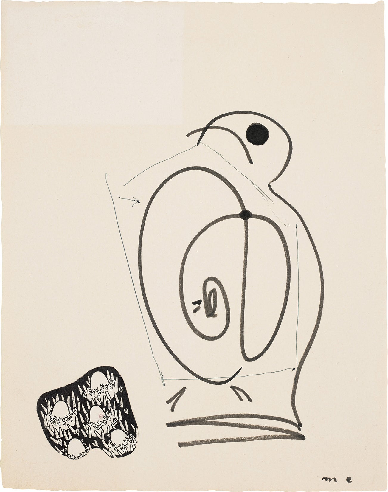 signed with the artist's initials 'm e' lower right