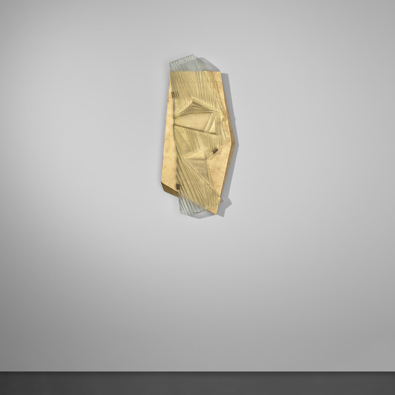 Moulded and sandblasted glass, lacquered and gilded wood, brass.