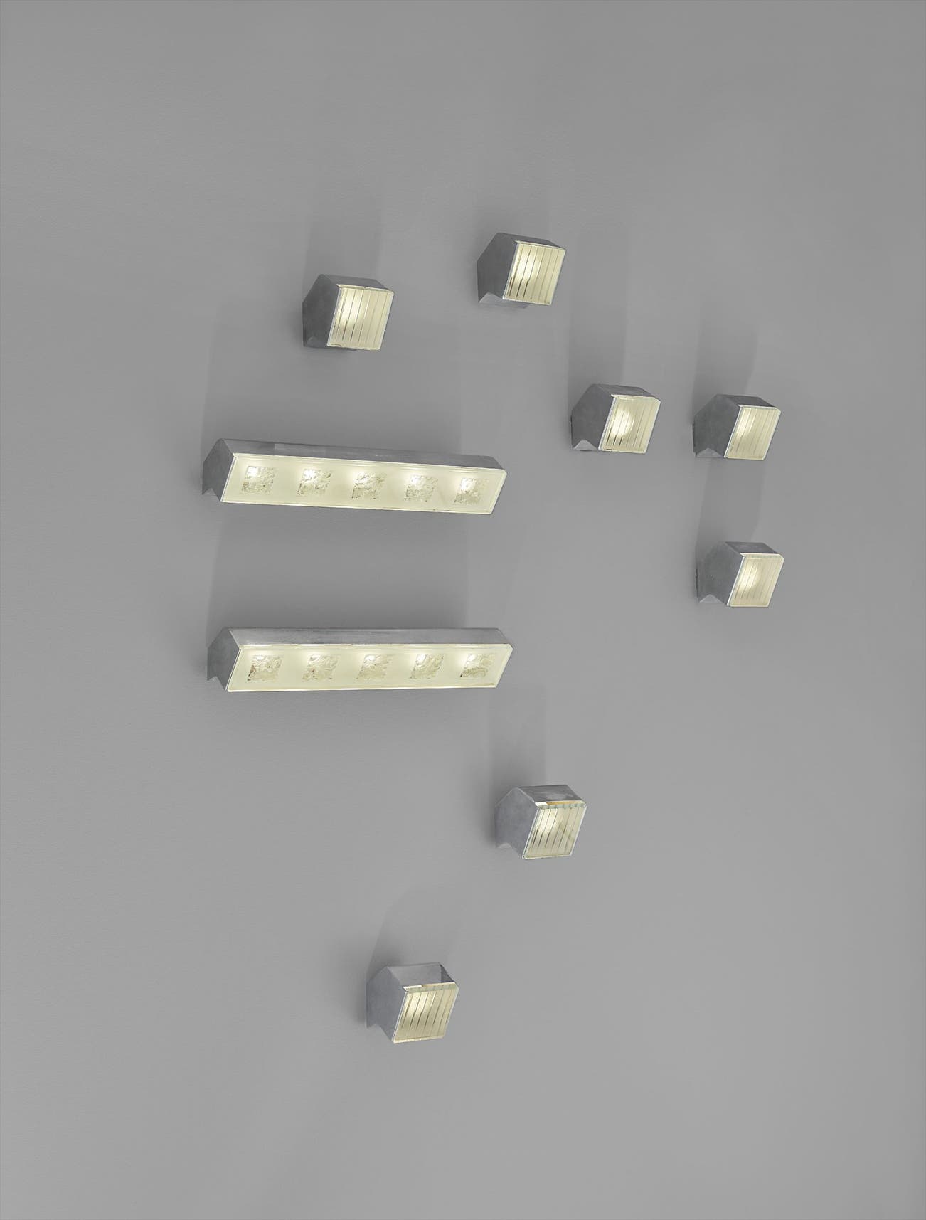Opaque, chiselled and carved clear glass, chromium-plated brass, painted brass, painted copper.