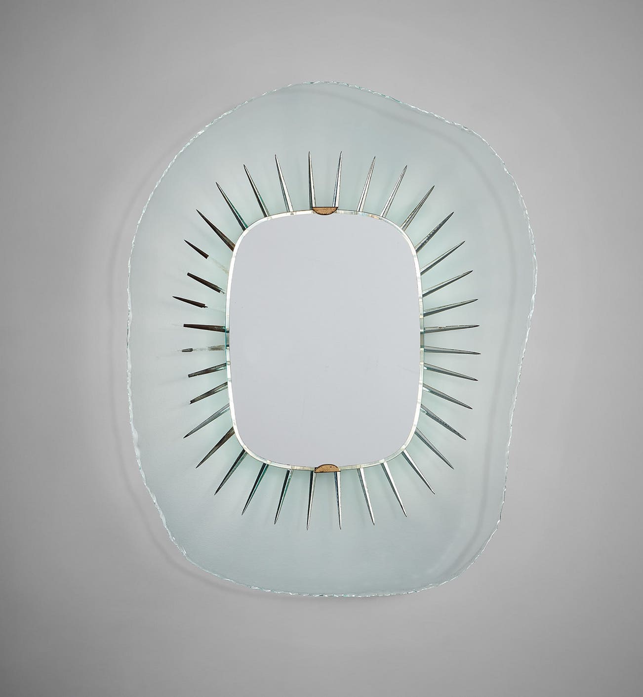 Chiseled and carved glass, mirrored glass, brass, painted aluminum.